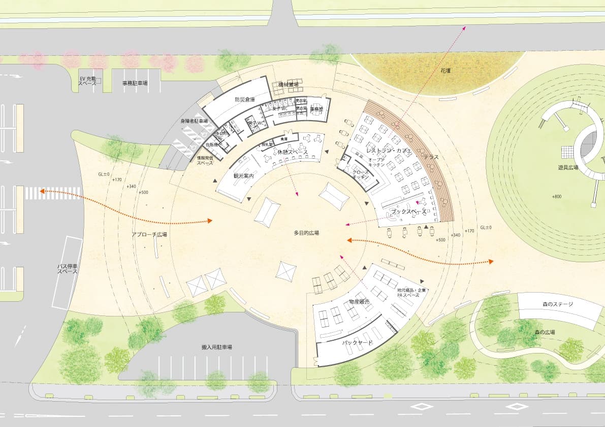 観光案内・休憩スペースは駐車場や多目的広場に向かって開かれています。トイレは駐車場からアクセスしやすい一方、他の棟から入口が見えないため、プライバシーに配慮したプランとなっています。