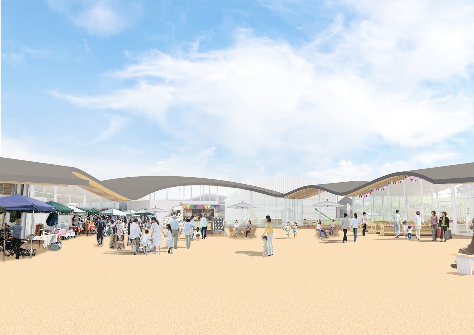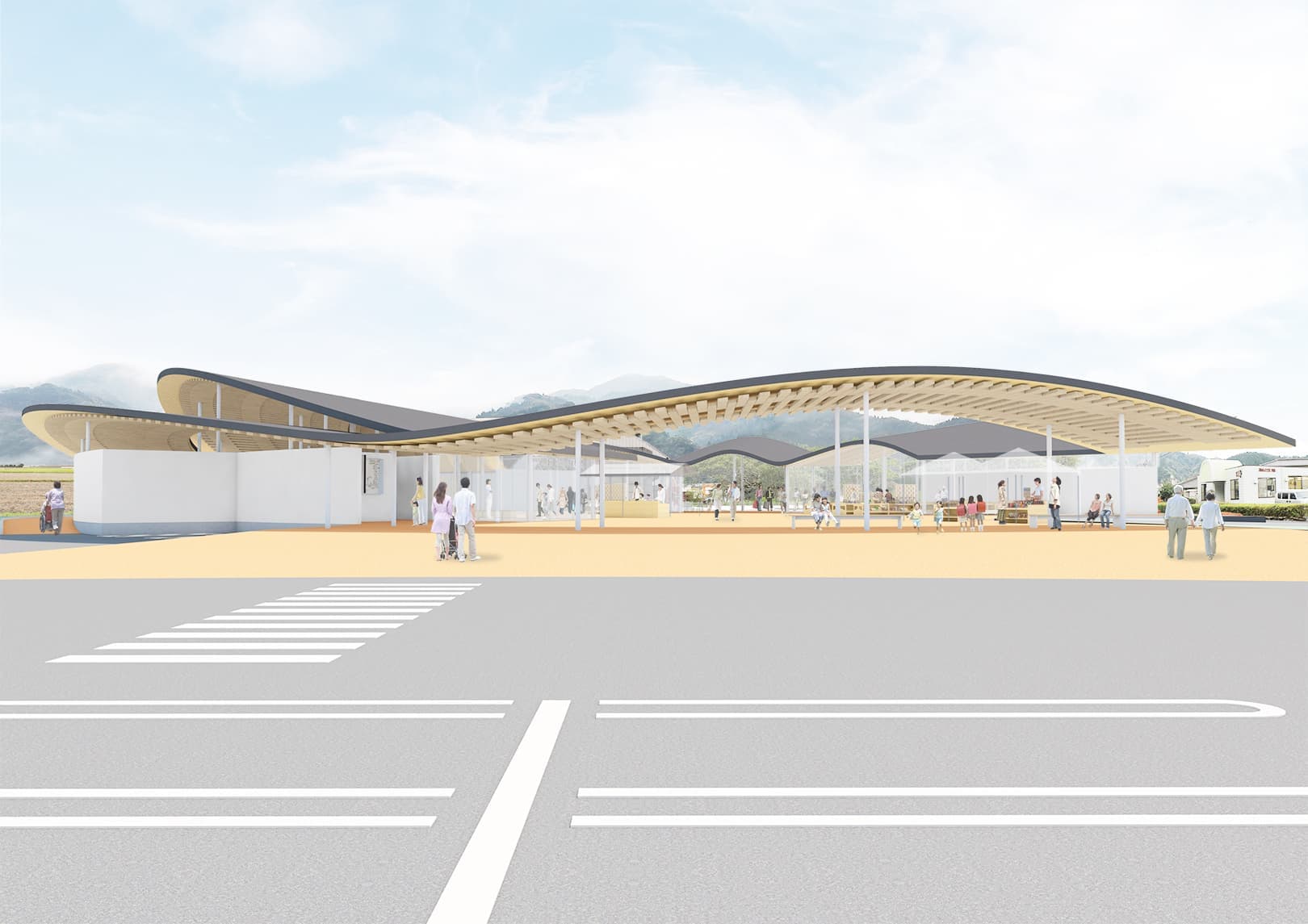 南側の道路から見たイメージです。多目的広場や物産販売棟が道路に向かって開かれており、施設内へ人々を引き込みます。