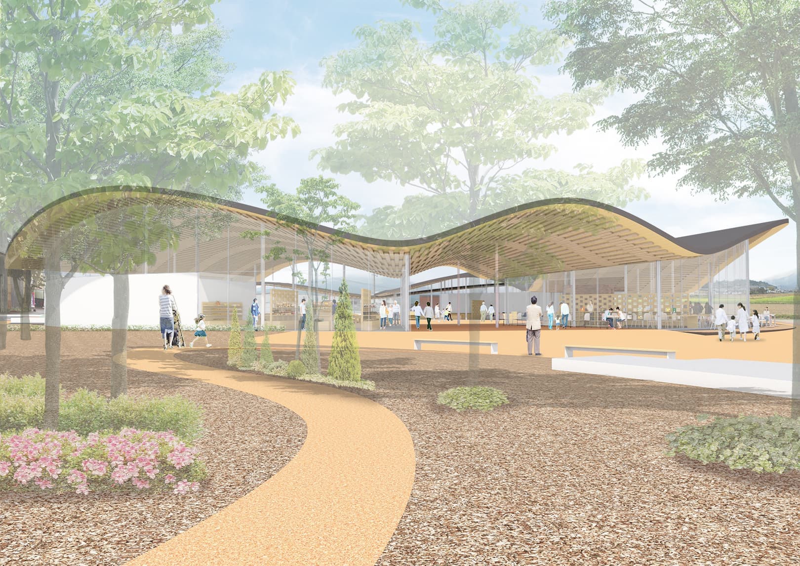 私たちはこの山並みに囲まれた豊かな風景に呼応するように、飫肥杉を編み込んでつくるやわらかな木の屋根に包まれた道の駅を提案しました。この屋根とそれを取り巻く複数の広場によって、多世代の人々が利用できるまちの拠点をつくります。