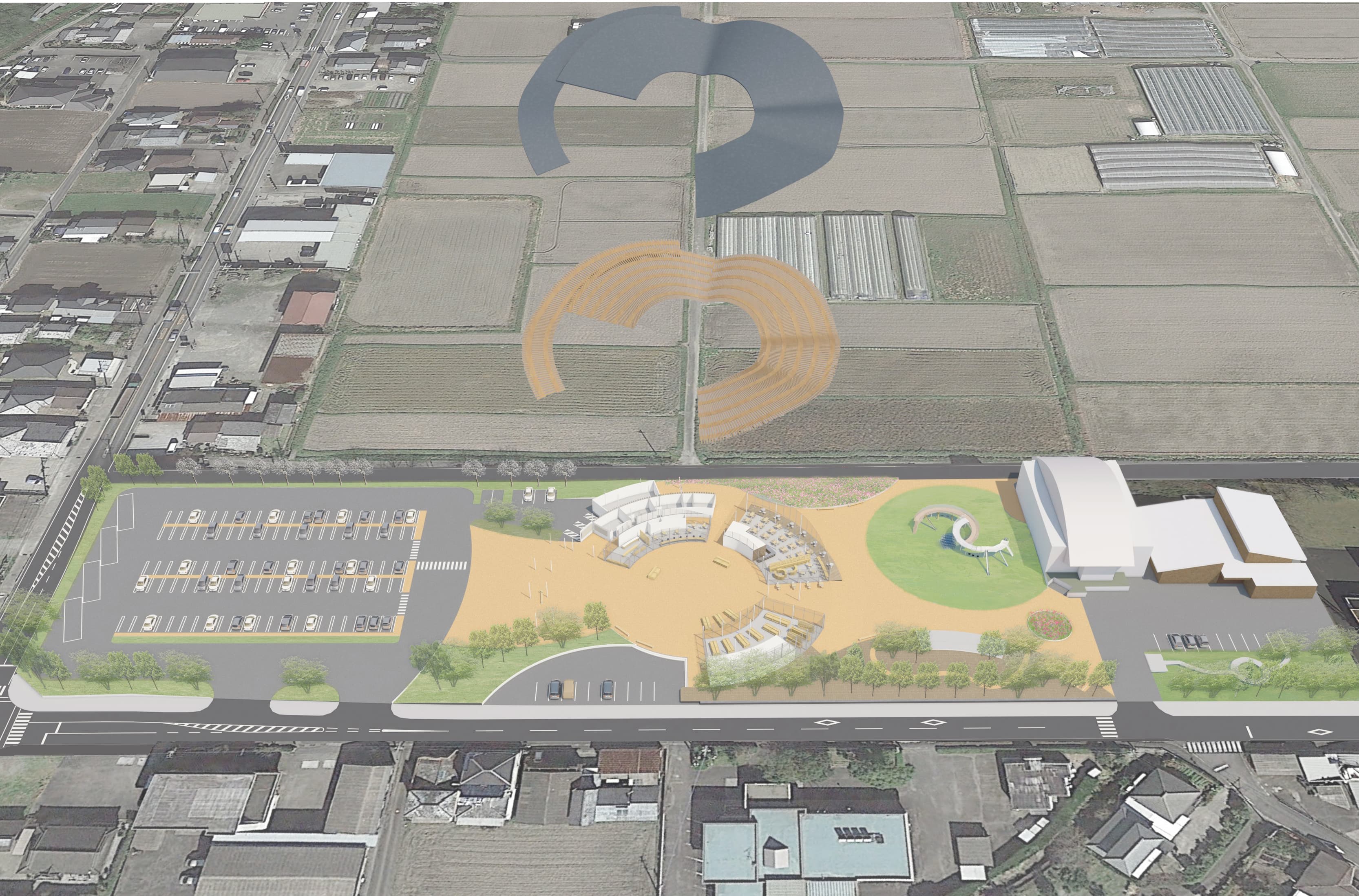 計画地は北郷駅から歩いて数分の場所に位置し、敷地に立ちますと各方面に山並みの風景を望むことができます。そして北側に広がる田畑の風景と南前面道路からのアクセスといった南北の方向性を意識します。同時に、東側のふれあい交流センターや図書館との連携、西側県道からの視認性といった、東西軸も重要になってくることがわかります。そこで一定の方向だけに開いた施設ではなく、各方面に対して顔を持たせることが重要であると考え、円形の平面形状を考えました。