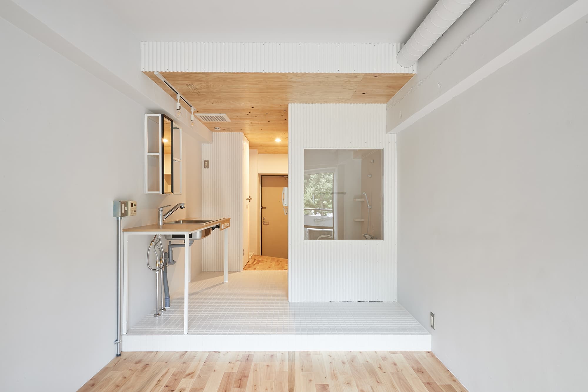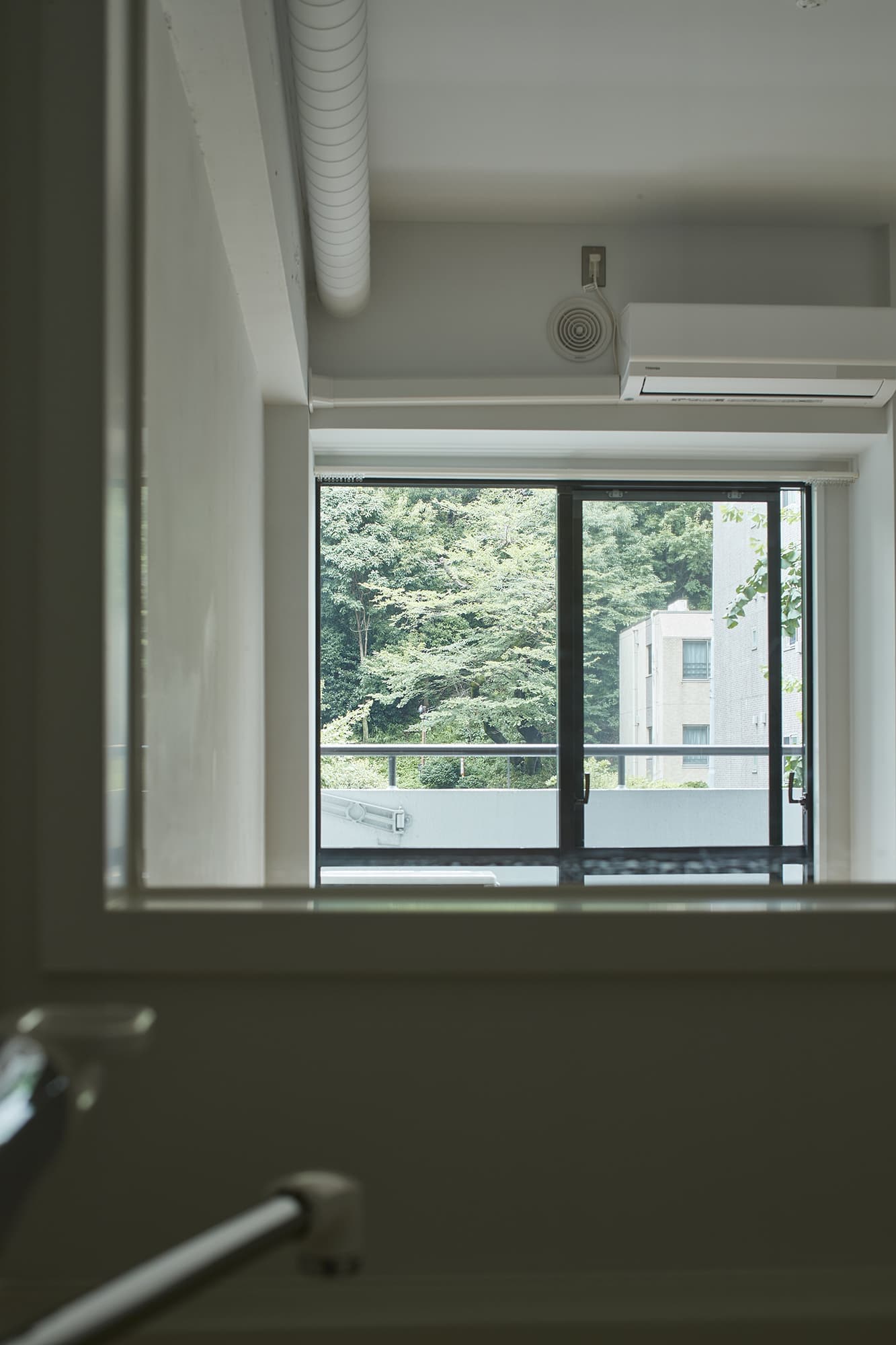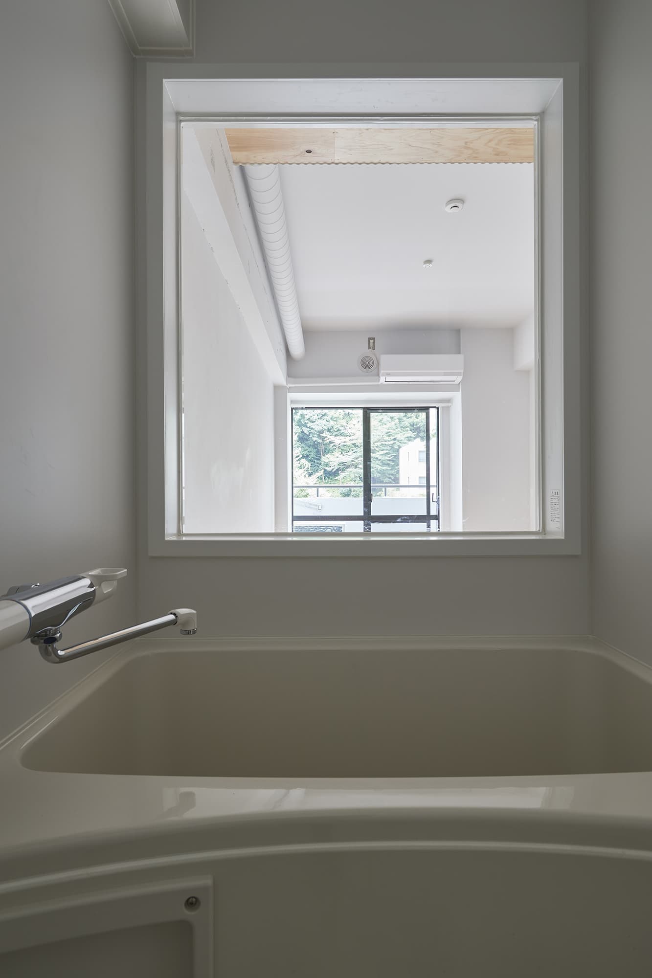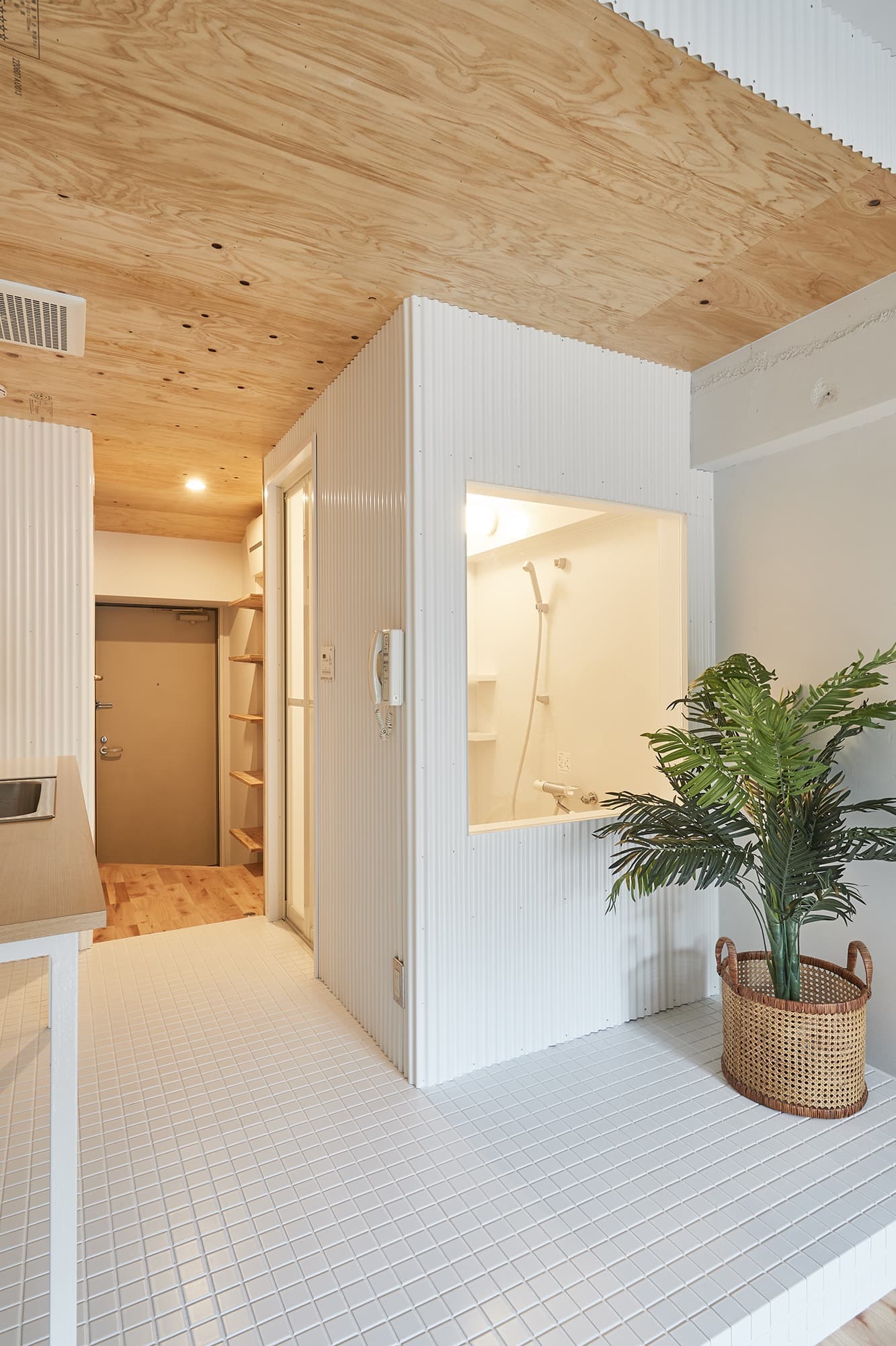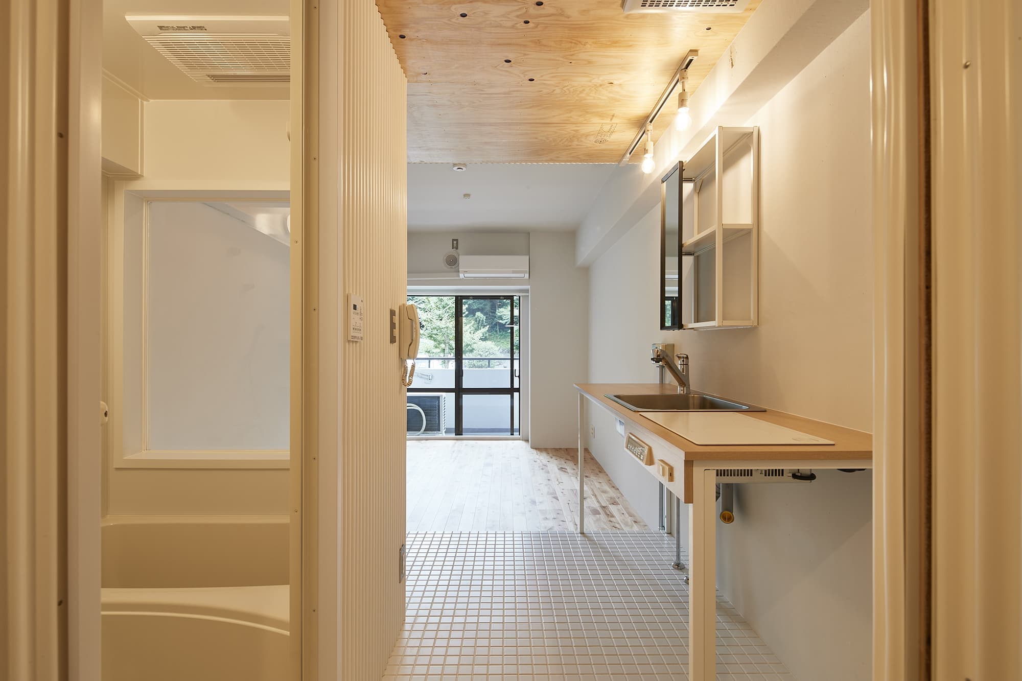 1人暮らし用のワンルーム賃貸住戸リノベーション計画です。都心にいながら緑を感じることができるこの住戸において、外の景色を活かしつつ住戸内にも植物を飾ってゆったりと暮らせるような住まいの計画を考えました。30年以上前の一般的なワンルーム分譲賃貸では室内面積や投資利用などの理由からお風呂やキッチンに予算をかけていない住戸を散見します。例え1人暮らしの賃貸であっても、働いて帰ってきた家でゆったりとお風呂に浸かって次の日を快適に迎えてもらいたいと考え、20㎡程度の小さな部屋にお風呂を独立して設け、そのお風呂からは外の景色が見えるように大きな窓を設けました。またお風呂の窓の外には観葉植物を飾ることもできるタイル貼りのガーデニングスペースを設けました。ここに植物を飾ることでお風呂から室内の緑を見ながら過ごすことも出来ます。