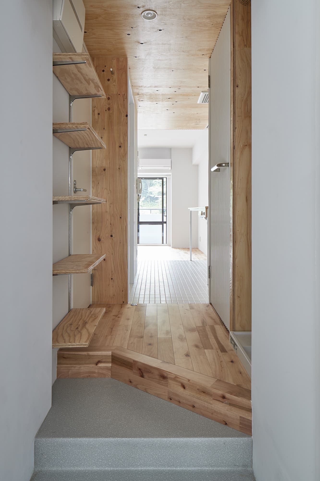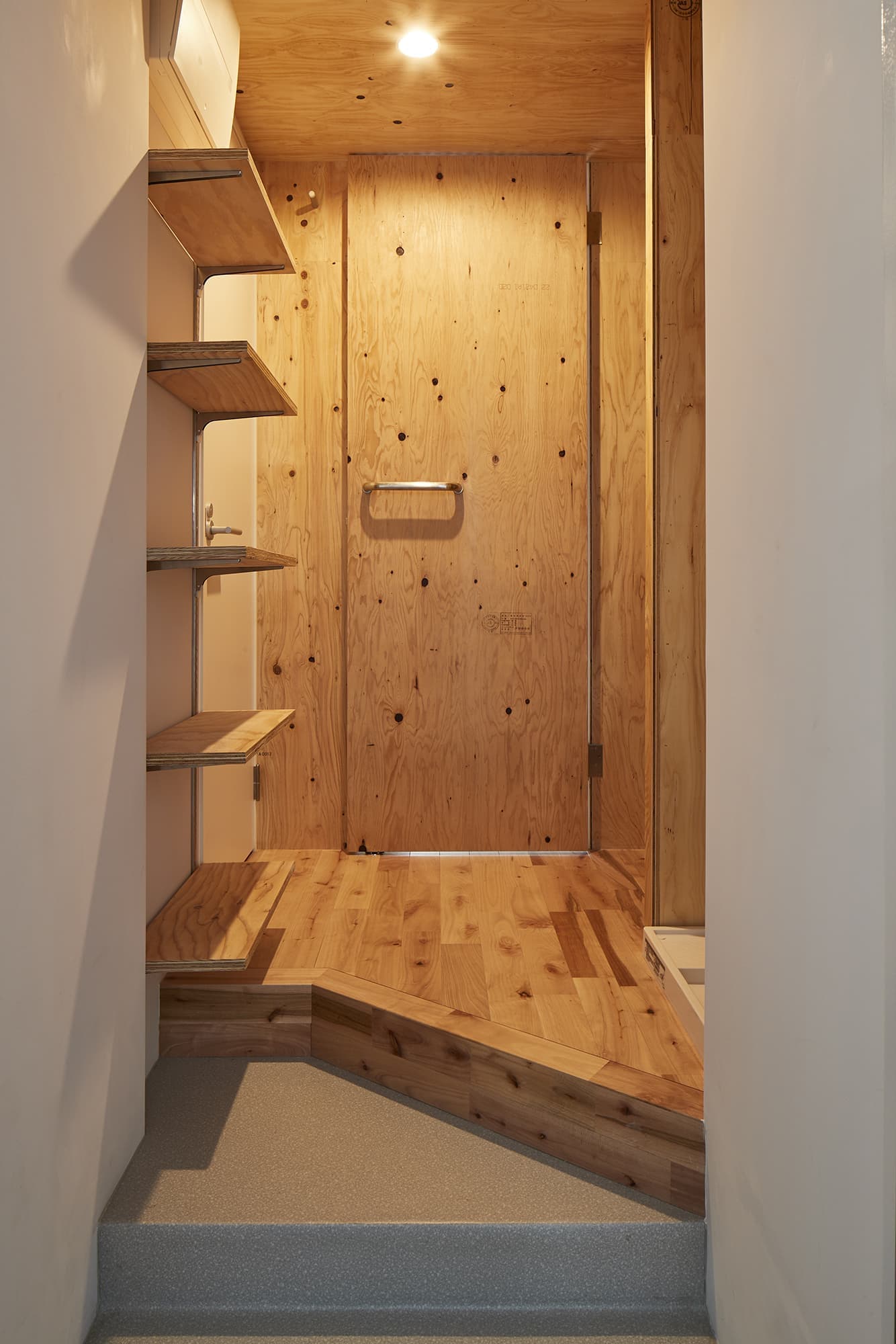 エントランスを抜けて右側に洗濯機置き場と収納スペース、左側にトイレを設置しています。収納扉は部屋の仕切りとしても使うことができます。