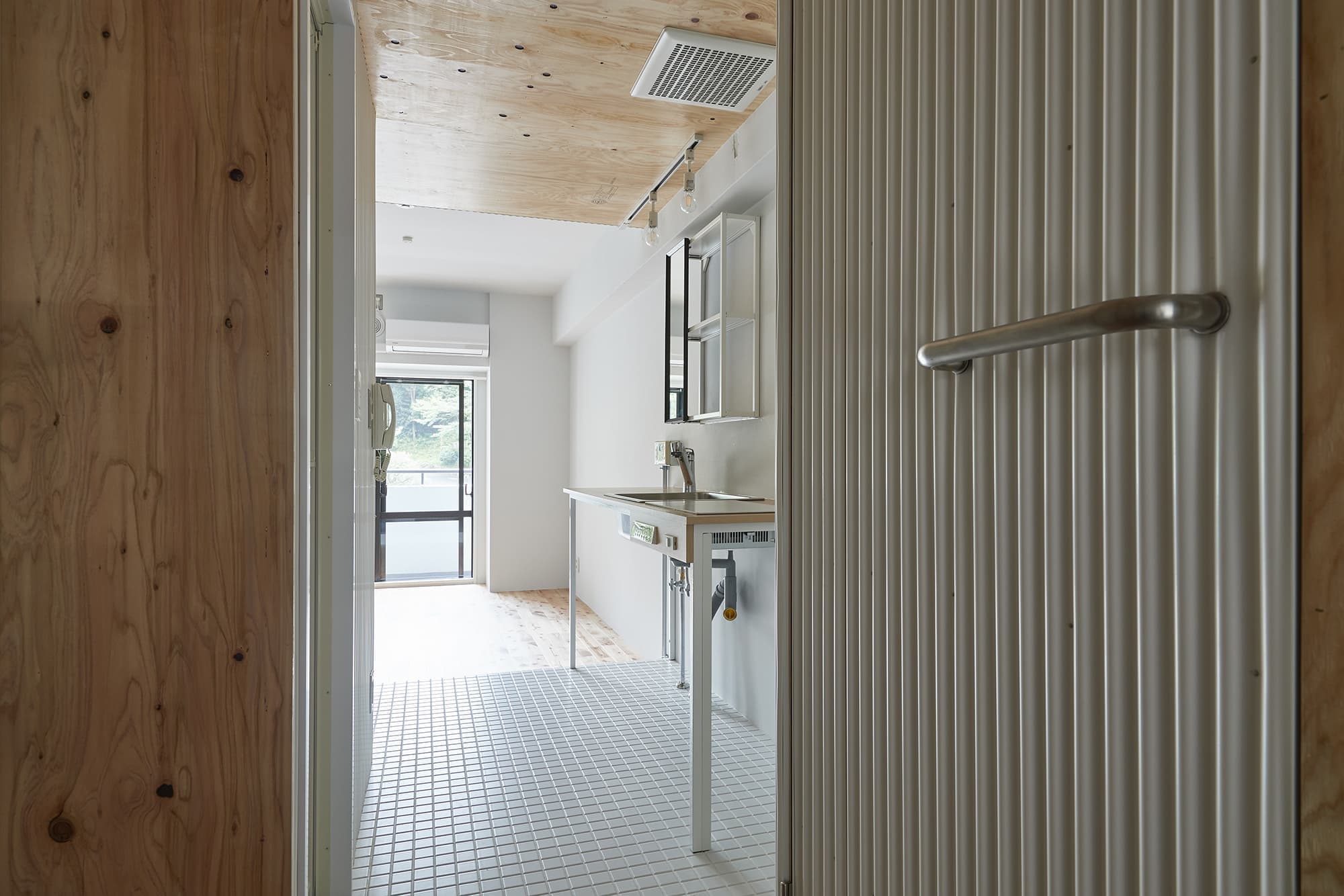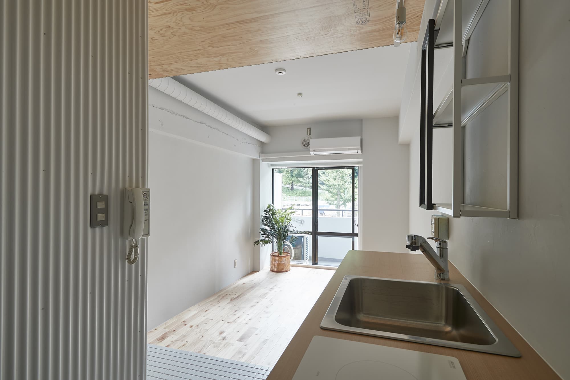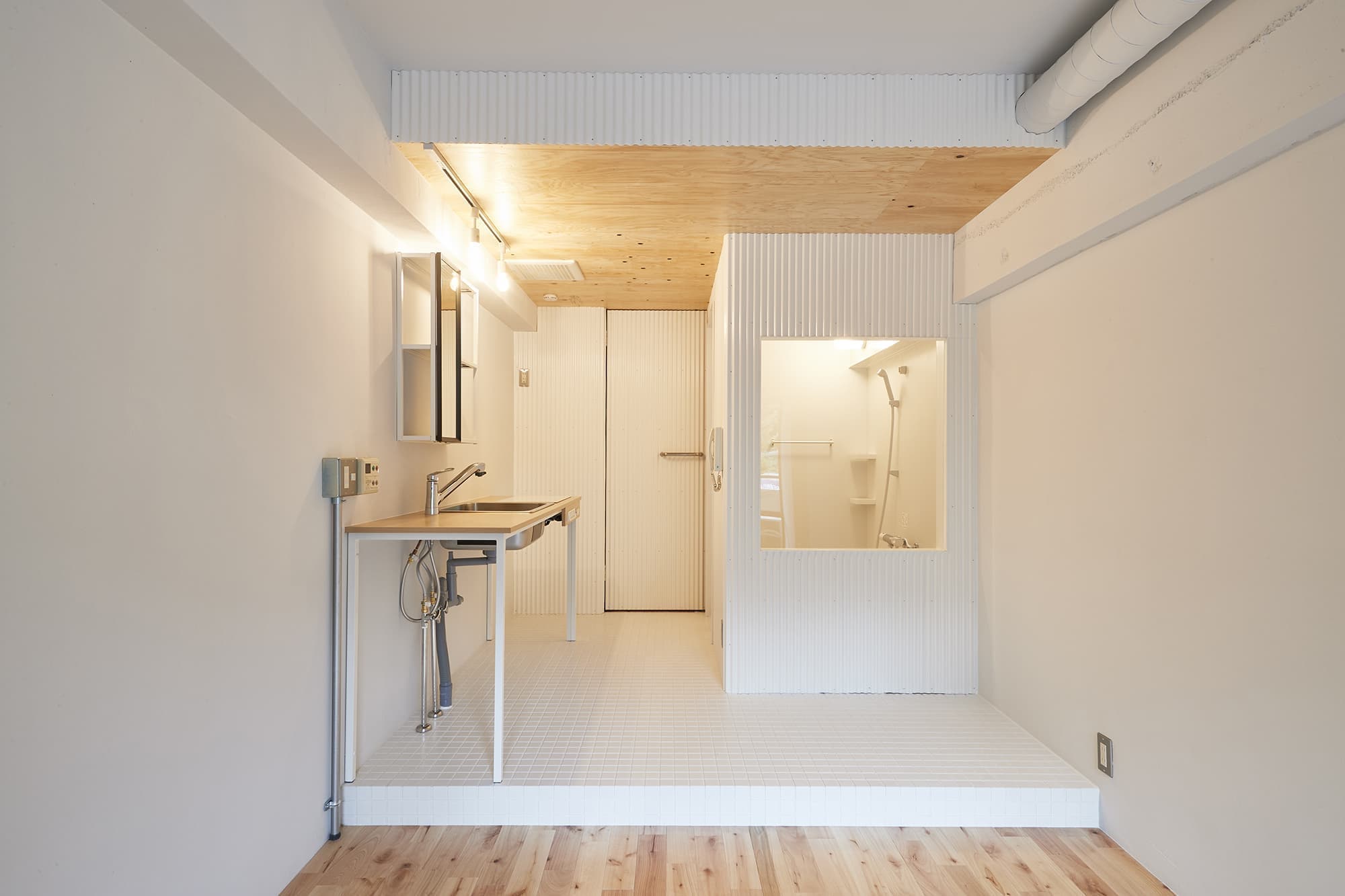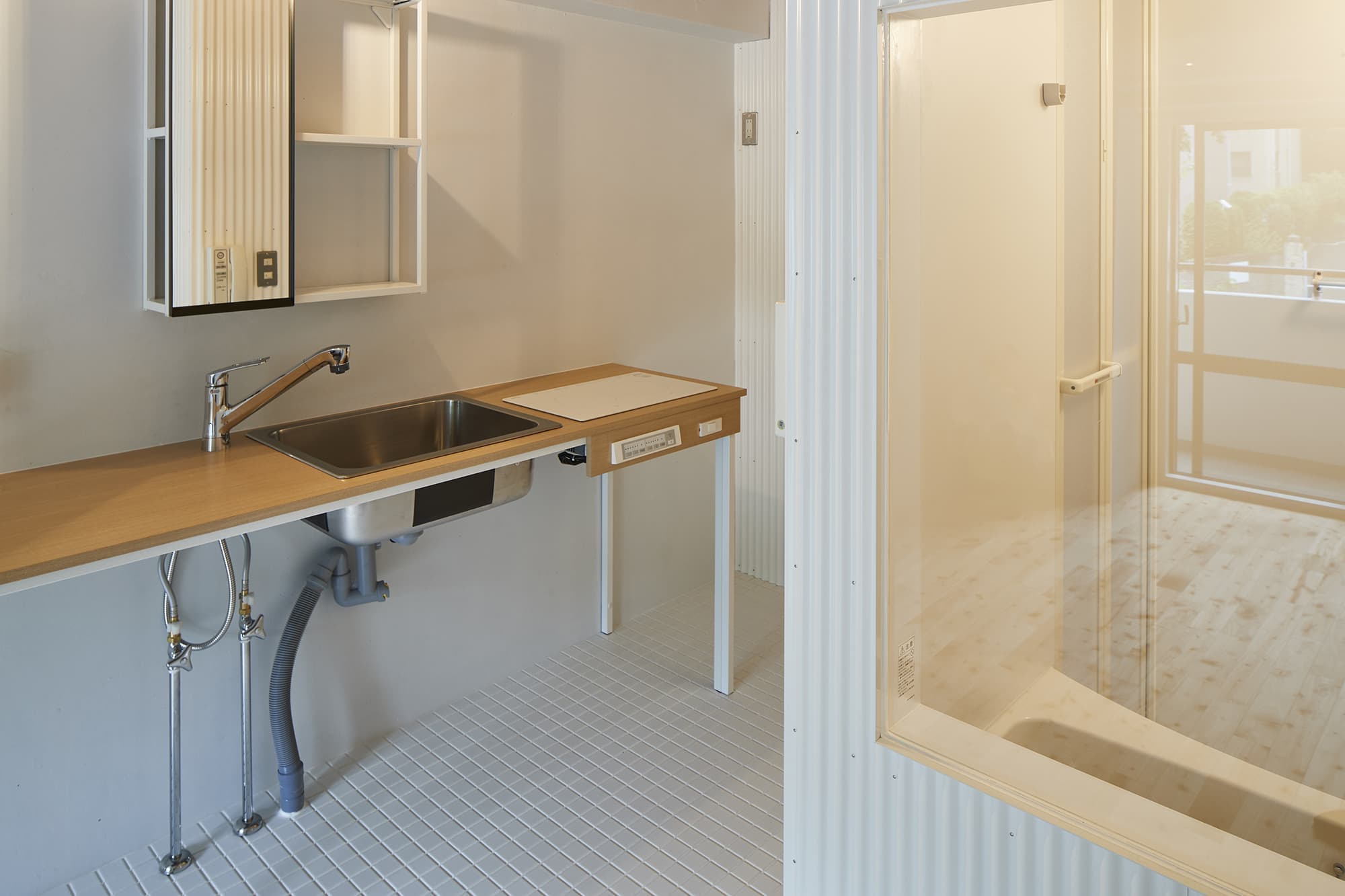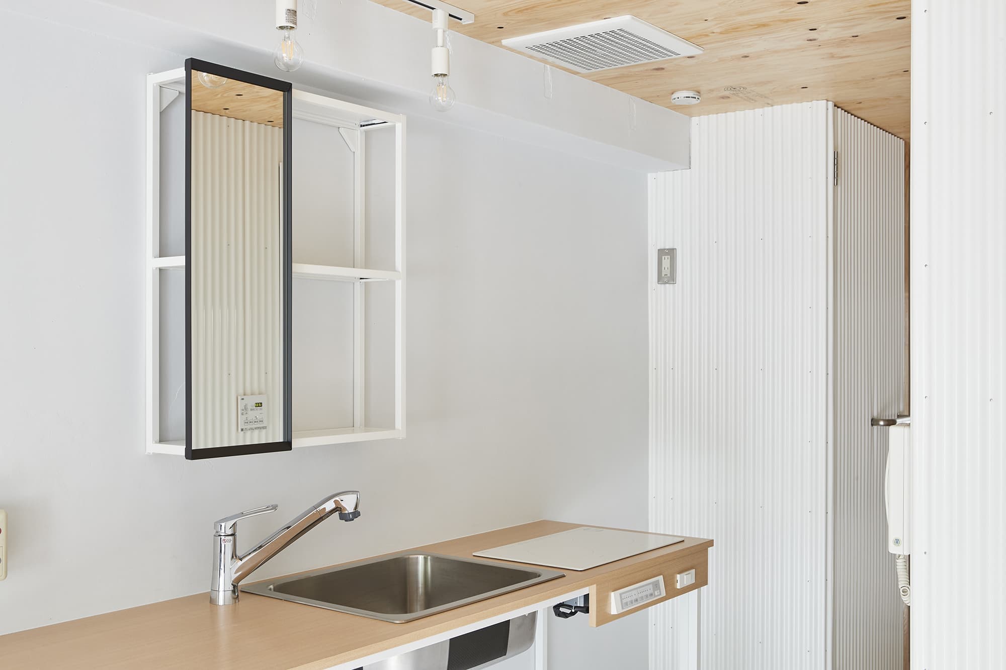ワンルーム内にあるキッチンはなるべく家具の様に見せるためスチールの足と木製の天板でシンプルなデザインとしています。1人暮らしでも十分に調理ができるよう、横2列のIHコンロを採用しています。またシャワー付き水栓、可動式の鏡を設置することでここを洗面スペースとしても利用することができます。作業台の部分はドレッサーのように利用することもできます。