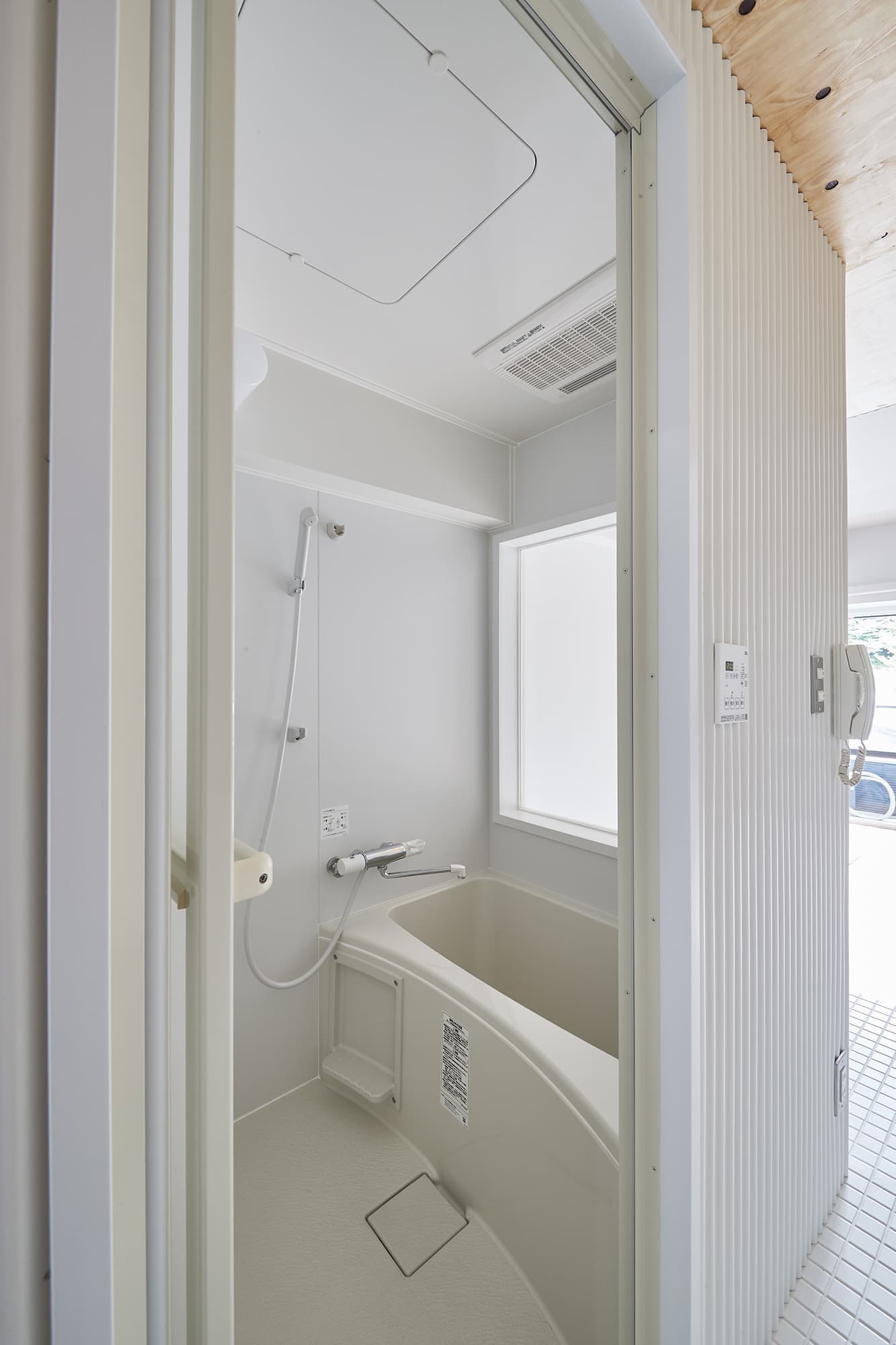 20㎡のコンパクトなワンルームでも緑の景色を楽しめる窓付きお風呂を設けました。窓の外にはタイル貼りのガーデニングスペースを計画し、そこに観葉植物を並べれば好きな緑を見ながらお風呂に入ることもできます。仕事などで疲れた体を少しでも癒してもらえるような空間を考えました。