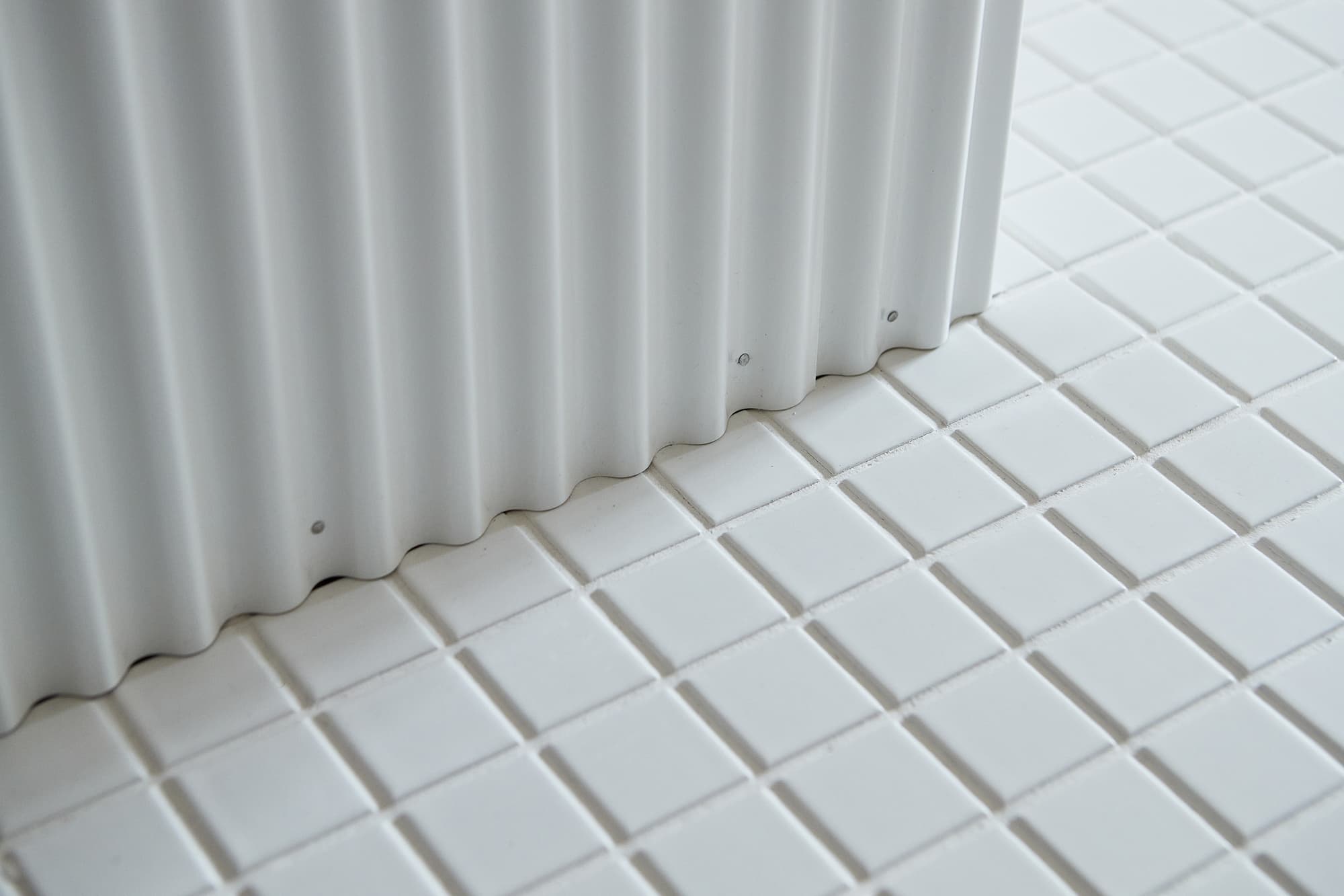 タイルは45mm角の白モザイクタイルを、波板はヨーロピアンホワイトカラーを採用しました。これらの仕上げは室内全体を明るくし、やわらかな雰囲気をつくります。