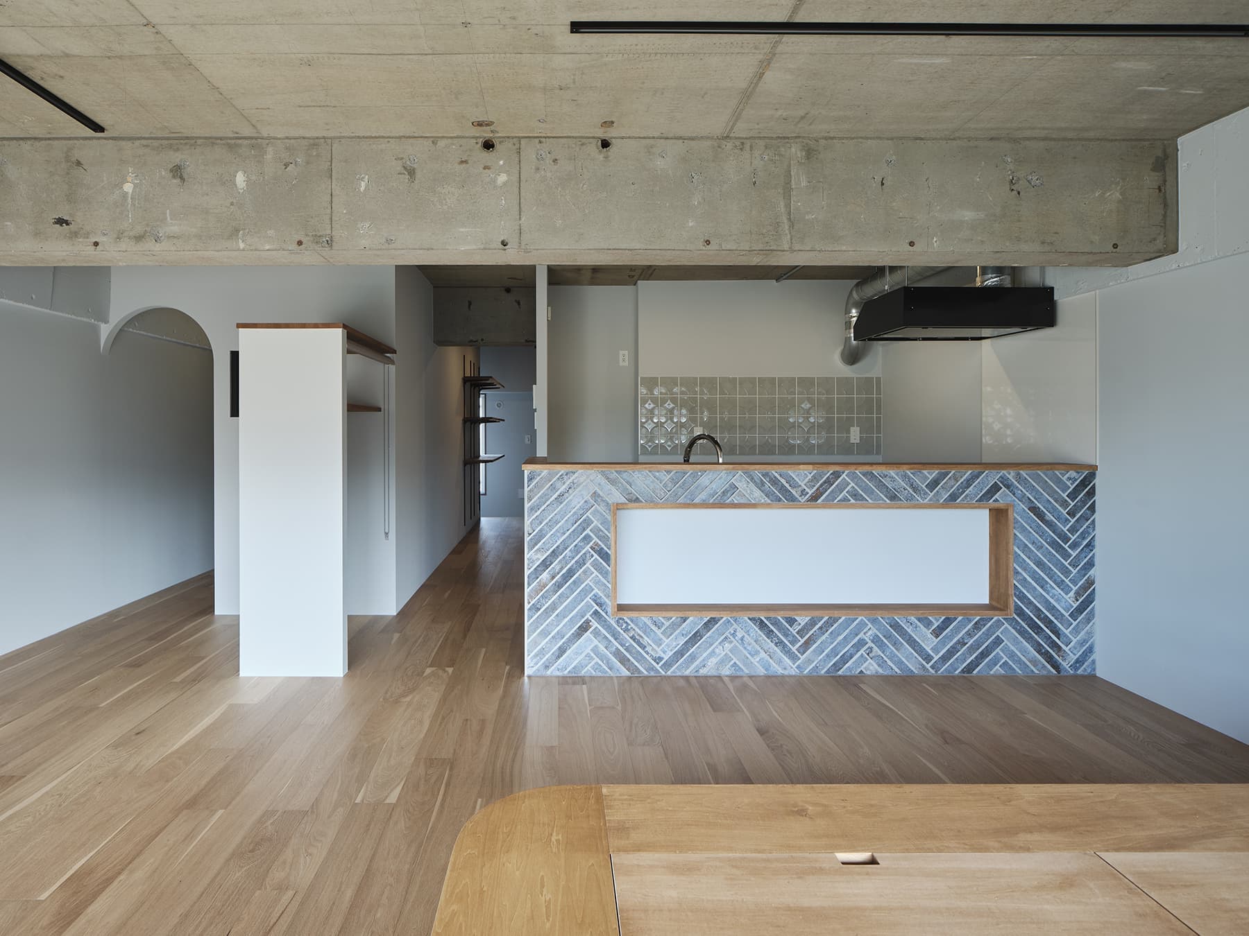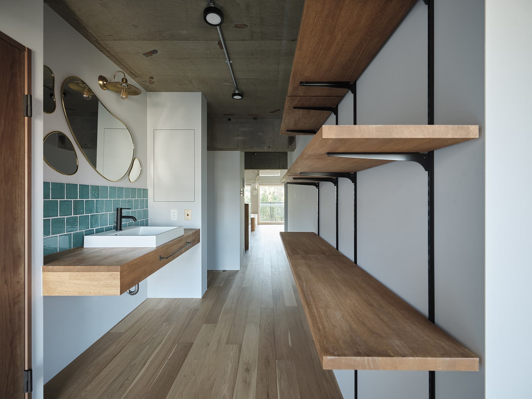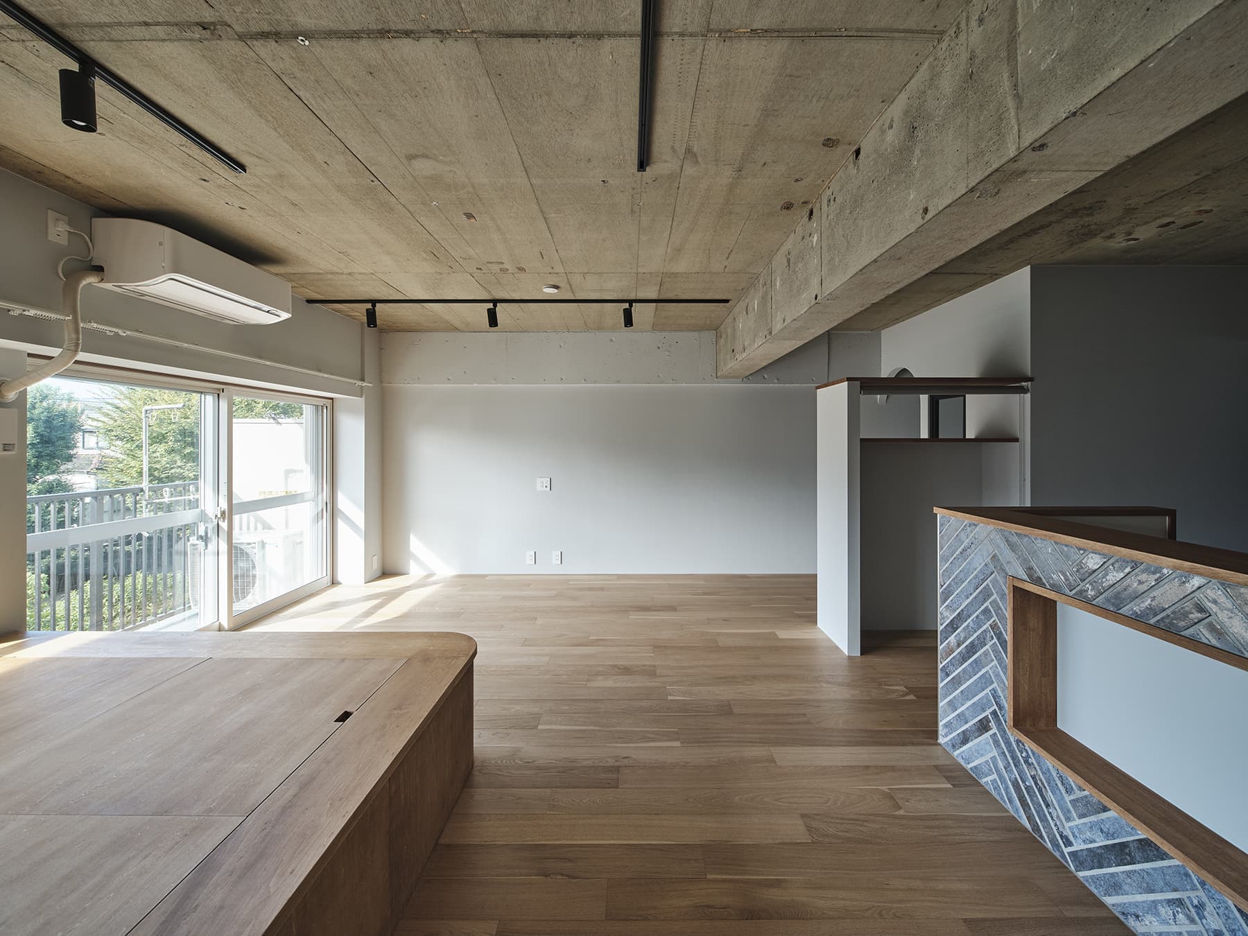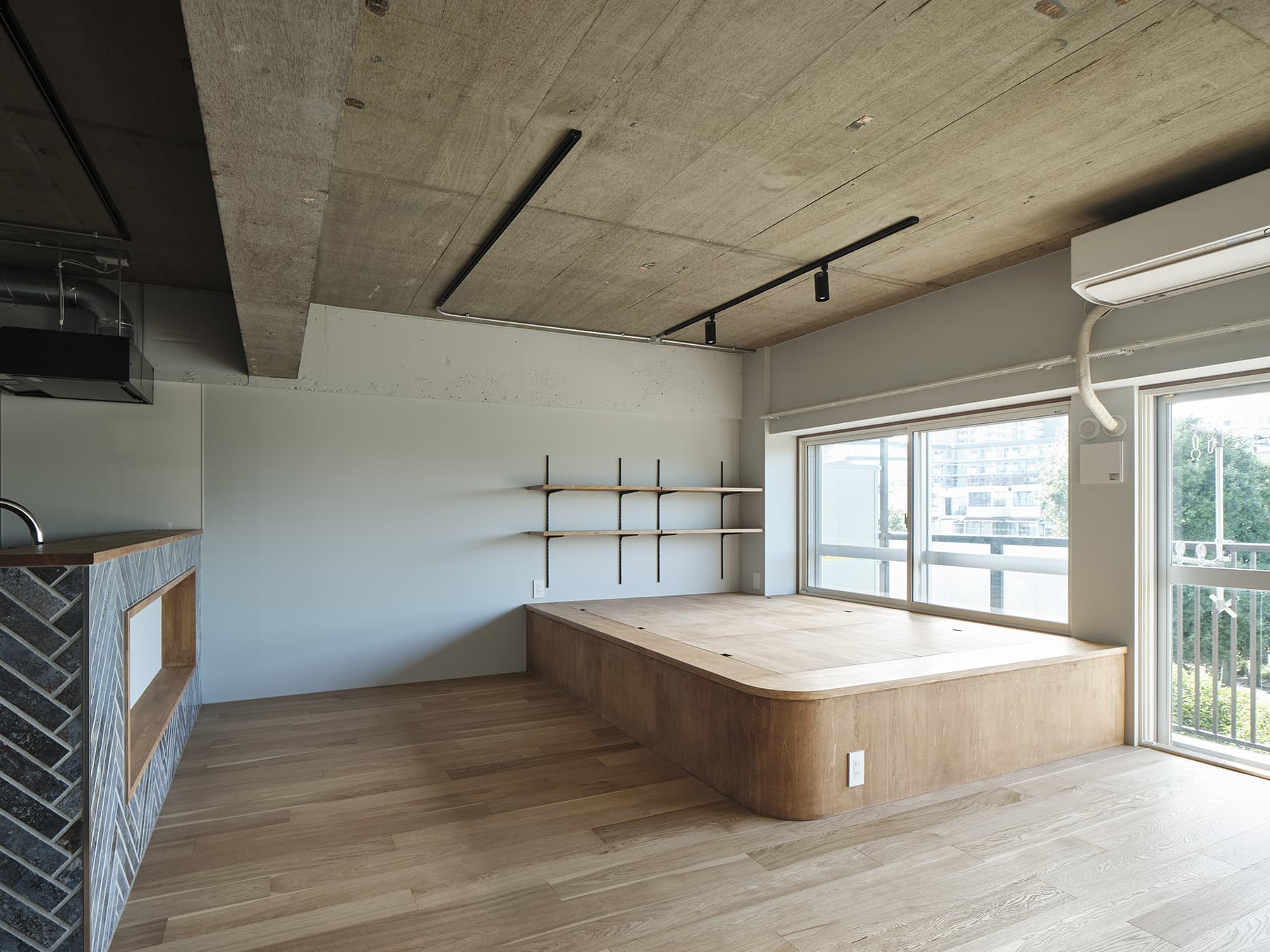 築約40年ほどのマンション住戸リノベーション計画。忙しい日常を過ごされているお施主様にとって、常に何かに追われるのではなく、ぼーっとする時間、余白をとり、気持ちのゆとりがもてる居場所を希望されていました。そこでワンルームの間取りを計画し、リビングやキッチンだけでなく、玄関や廊下スペースもゆとりをもたせて設けると共に、住戸全体に風の抜け道をつくり、住戸全体がおおらかな設えとなるように考えました。緑豊かな周辺環境において、窓側にはリビングの他に小上がりスペースを設け、豊かな緑を眺めながらゆったりと過ごせる空間を計画しました。玄関を抜けてすぐの広々としたスペースには、オンオフの切り替えの場所として大切な洗面スペースをお施主様のこだわりがつまったデザインに仕上げました。