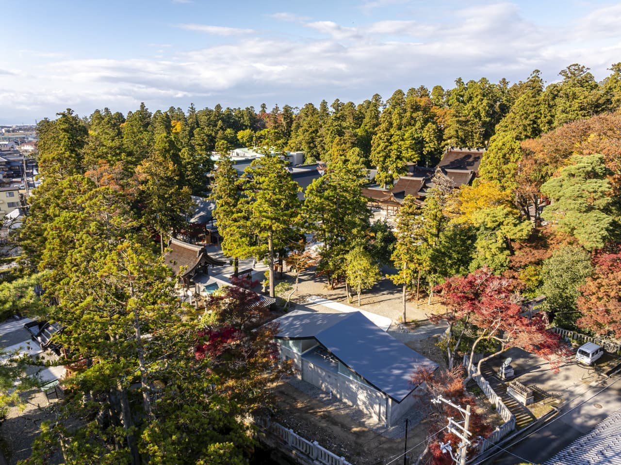 年間約170万人の参拝者が訪れる、滋賀県の多賀大社の参拝者用トイレ。境内にある建物との調和とシンボル性の両立、長期的な耐久性が求められました。既存トイレが建っていた境内の計画エリア周辺には多くの木々が育っており、これらはかつて、参道を歩く参拝者から既存トイレを隠すように植えられた木々です。ハレの場としての明るい参道との対比として、木々に囲まれた既存環境を利用し、緑の風景とその間から差し込む木漏れ日を顕在化させることを考えました。