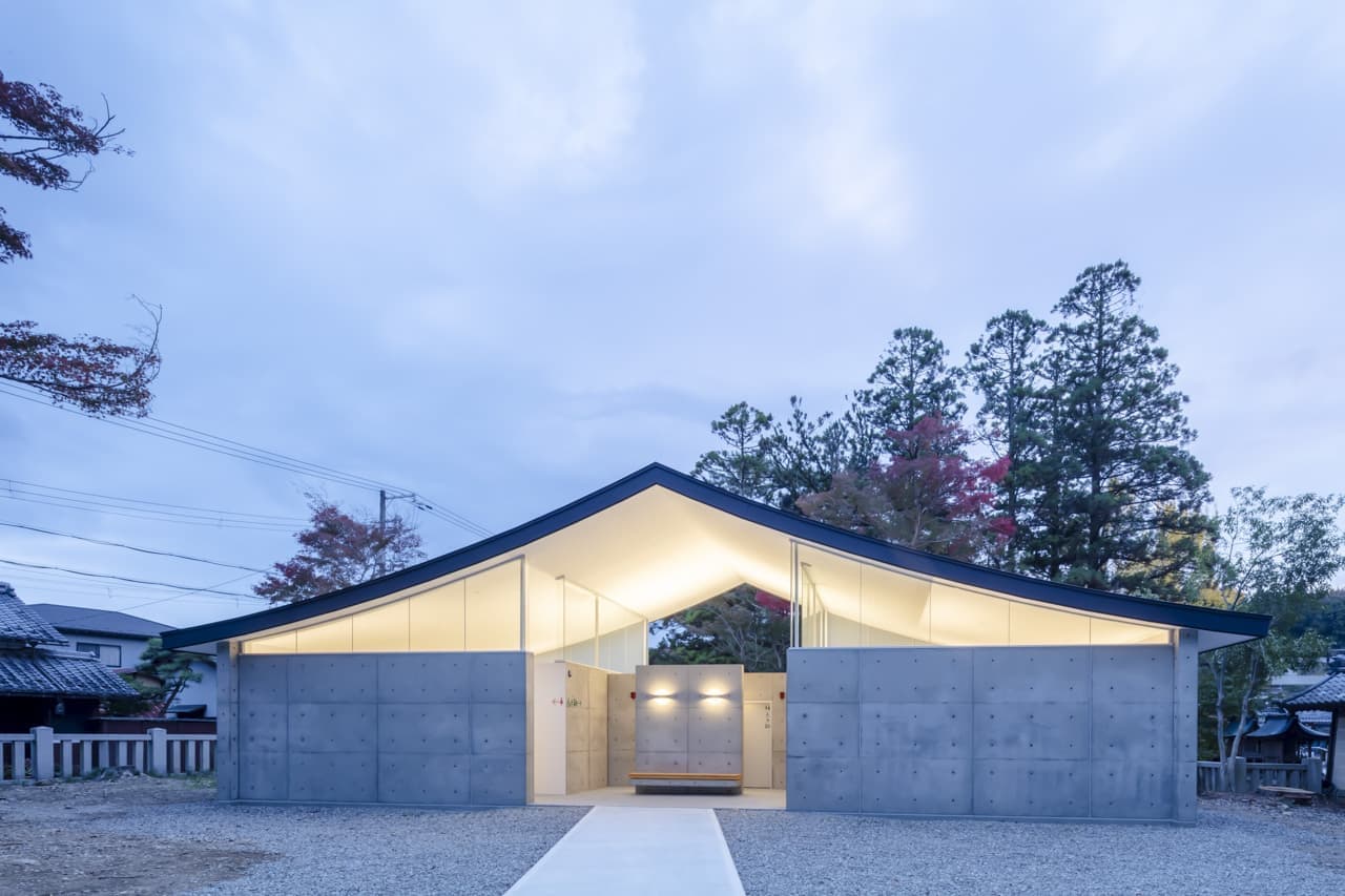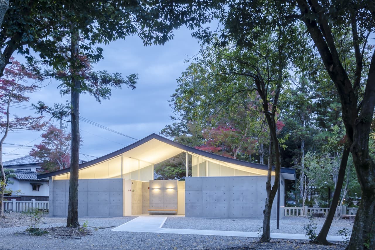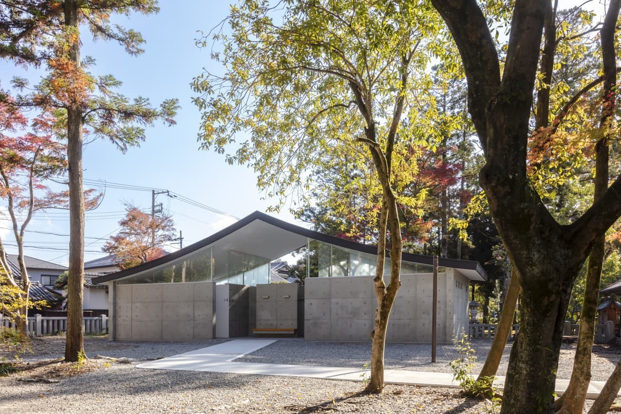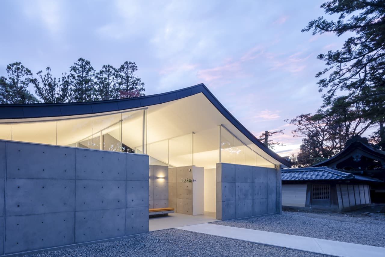 ソリッドなコンクリートとその上に浮かぶ反り屋根の構成によって数百年に渡る境内の風景に馴染みつつ、現代的なシンボル性も併せ持つトイレを目指しました。