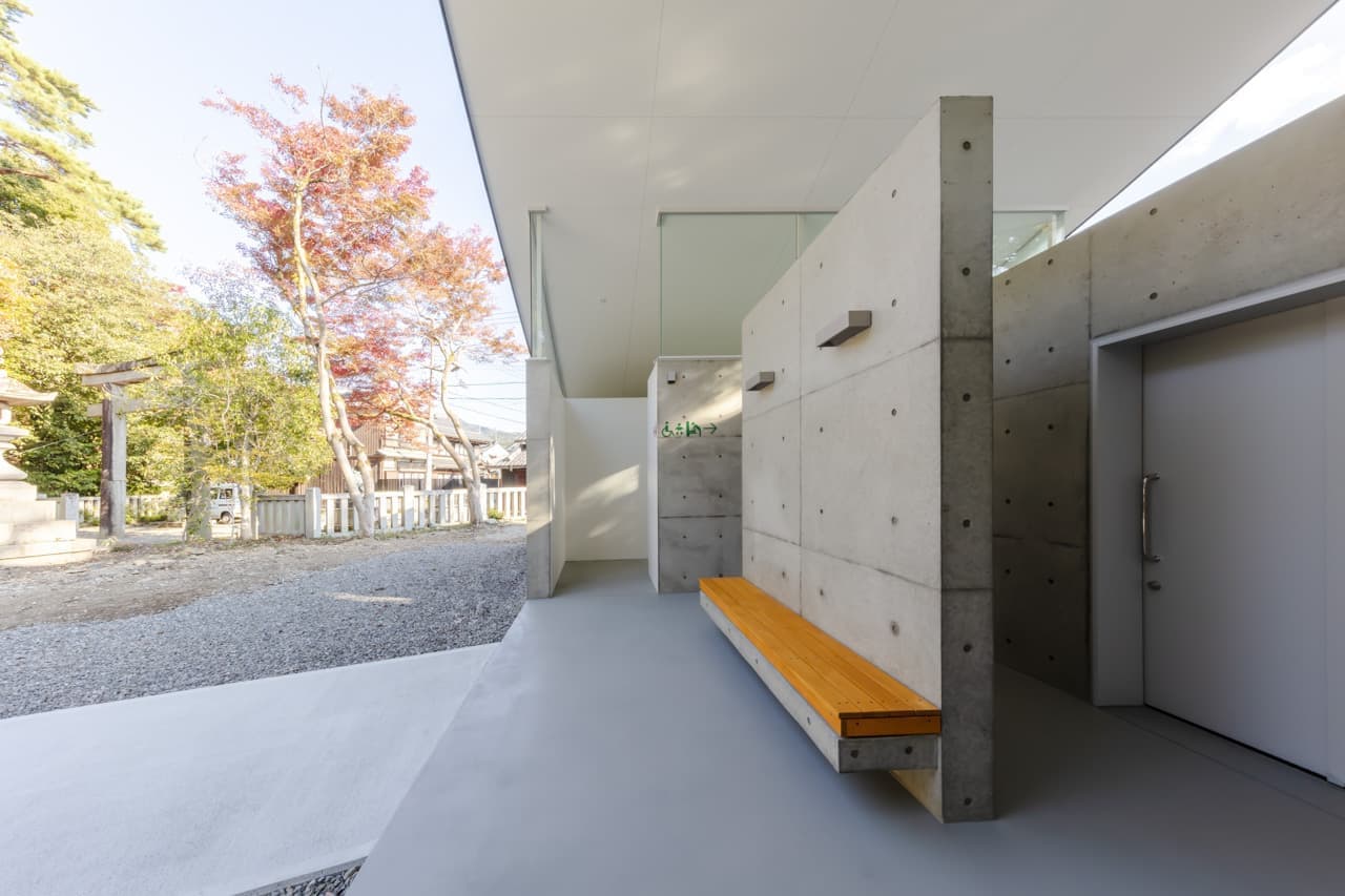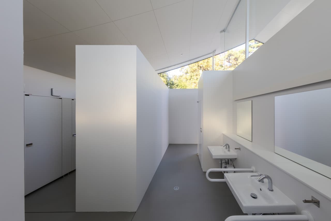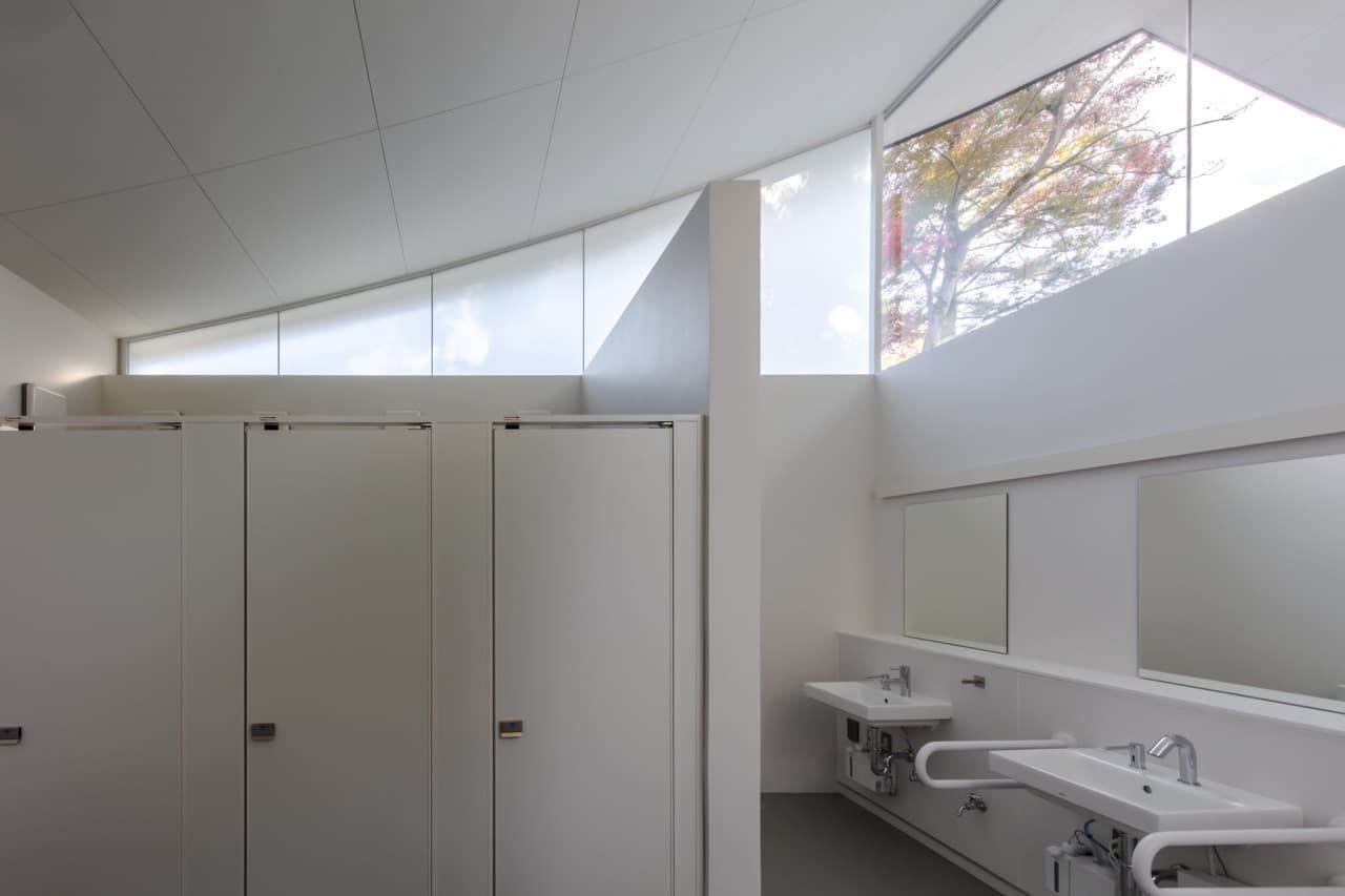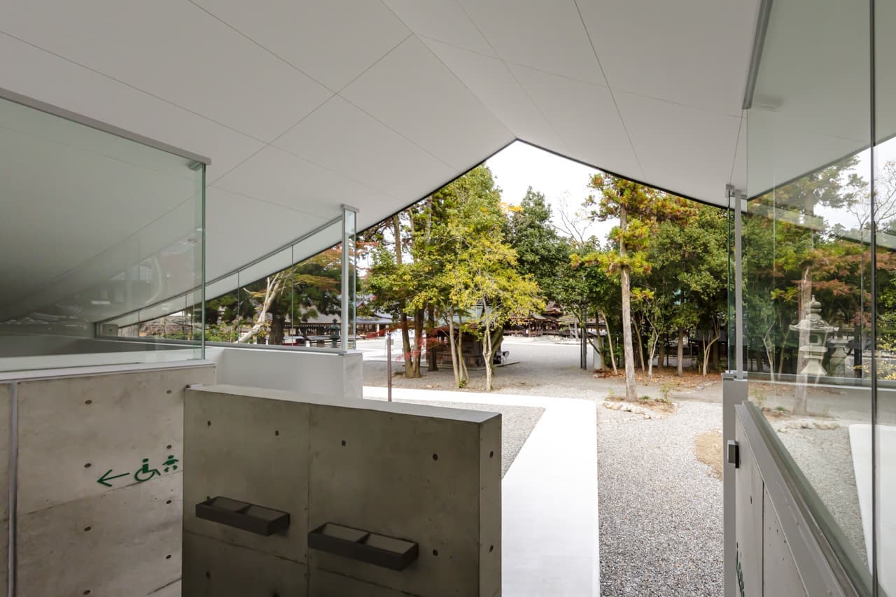 トイレ空間を2.6m高のコンクリート壁で囲み、その上に本殿を踏襲した反り屋根を架けています。室内ではプライベート性を保ちつつ境内の木々の緑が望め、木々の間から差し込む木漏れ日で満たされます。鉄骨梁と木梁を合板によりサンドして厚みを抑えた反り屋根は、軽やかで抽象的な存在となっています。。