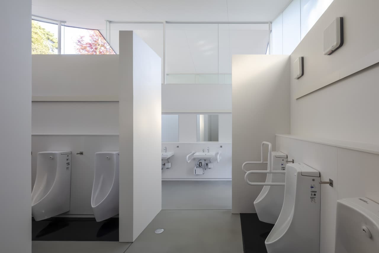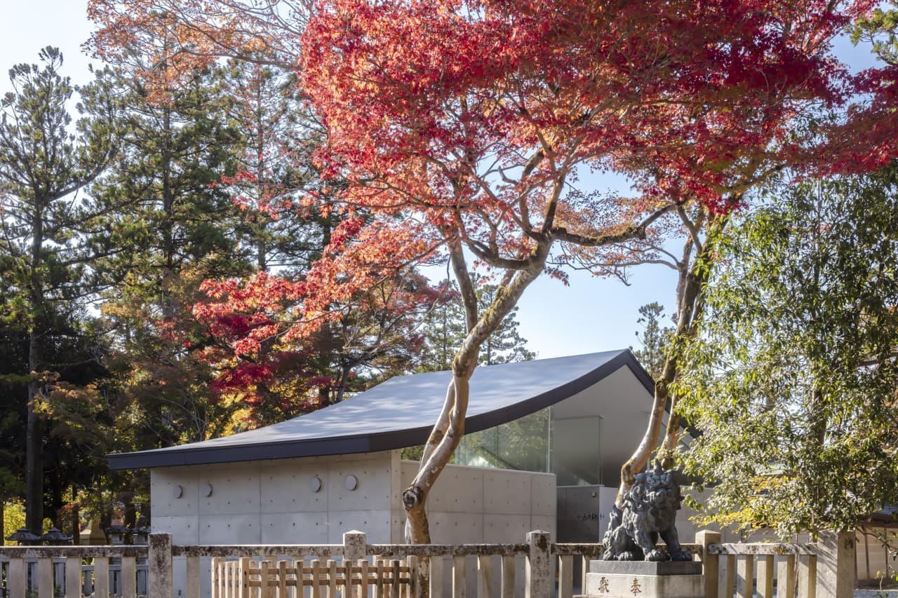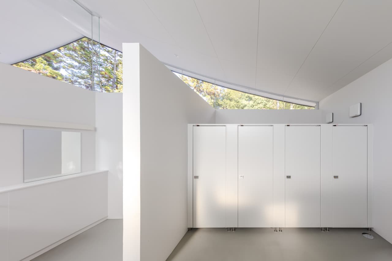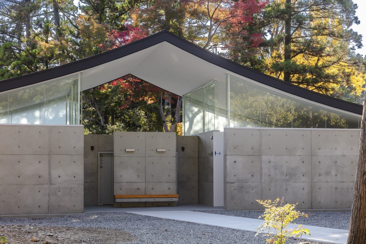 トイレ空間を2.6m高のコンクリート壁で囲み、その上に本殿を踏襲した反り屋根を架けています。室内ではプライベート性を保ちつつ境内の木々の緑が望め、木々の間から差し込む木漏れ日で満たされます。鉄骨梁と木梁を合板によりサンドして厚みを抑えた反り屋根は、軽やかで抽象的な存在となっています。。
