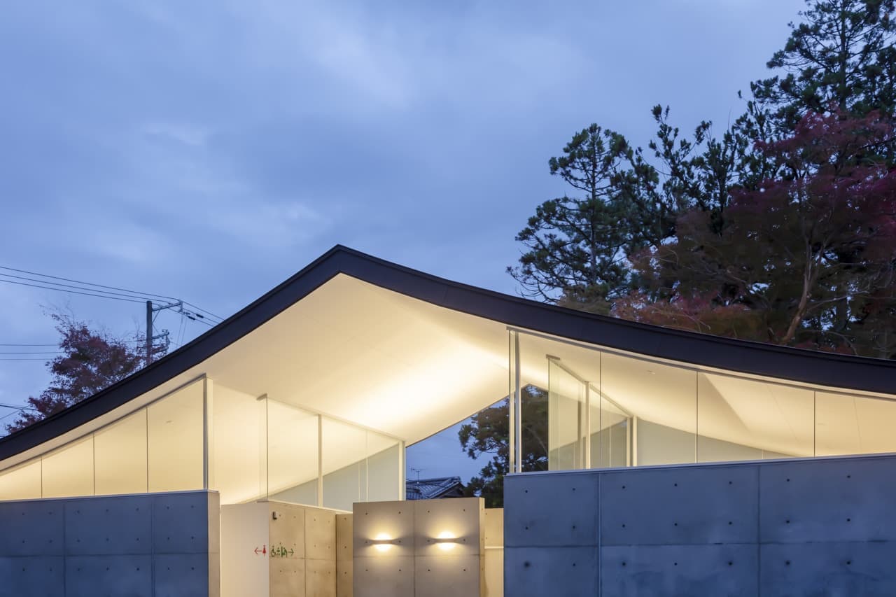 RC壁の上に浮かぶ鉄骨+木造の反り屋根