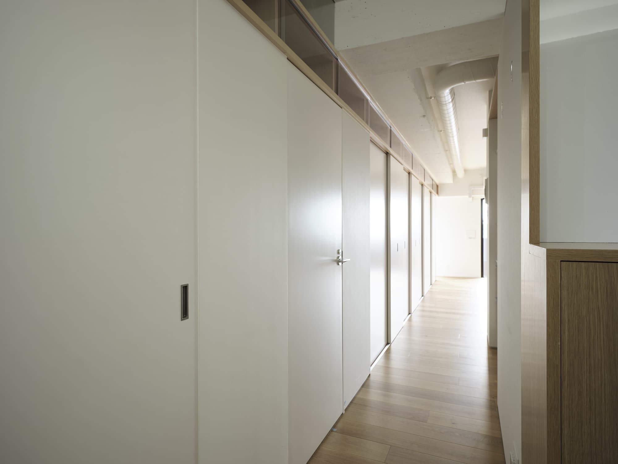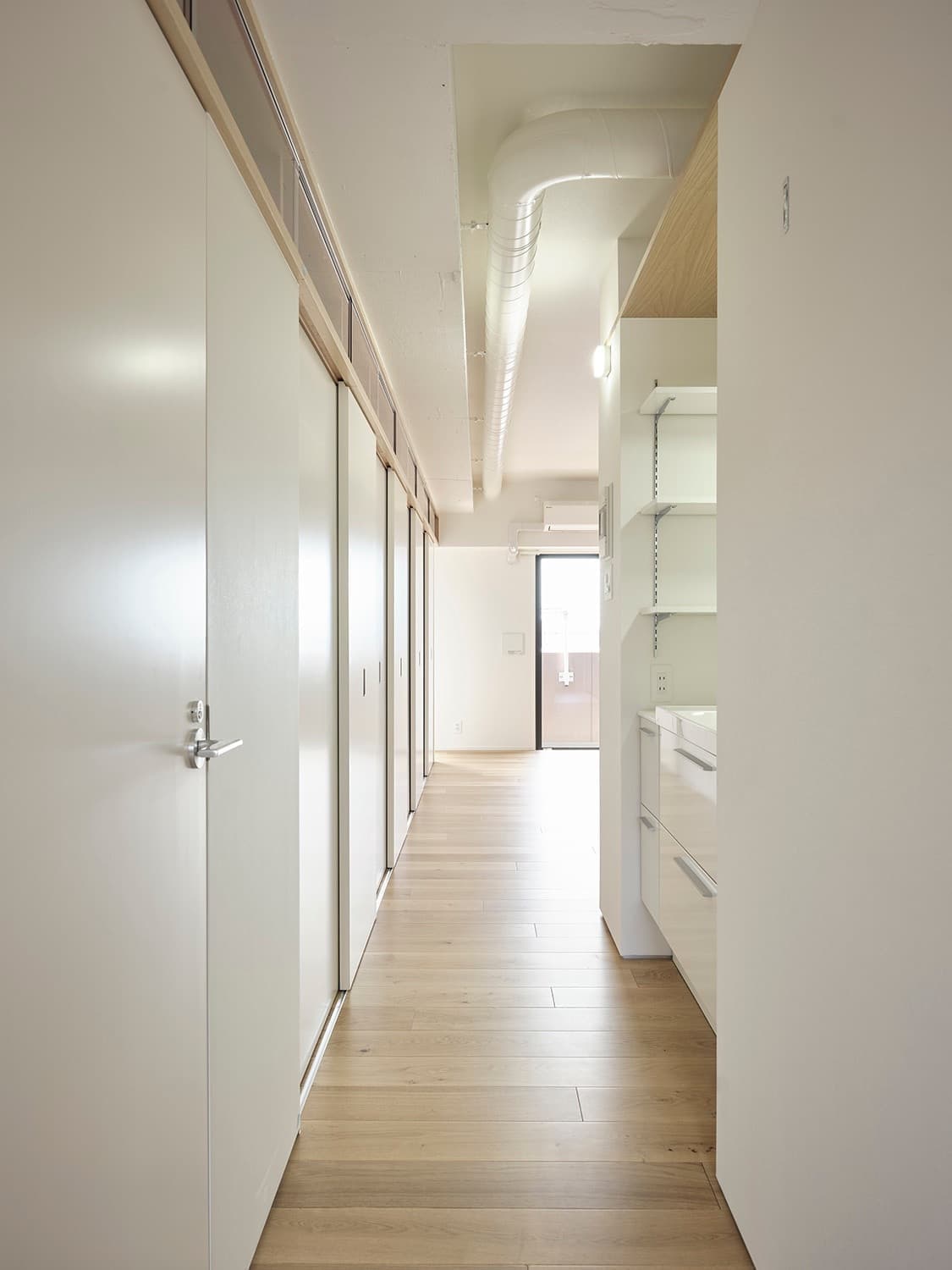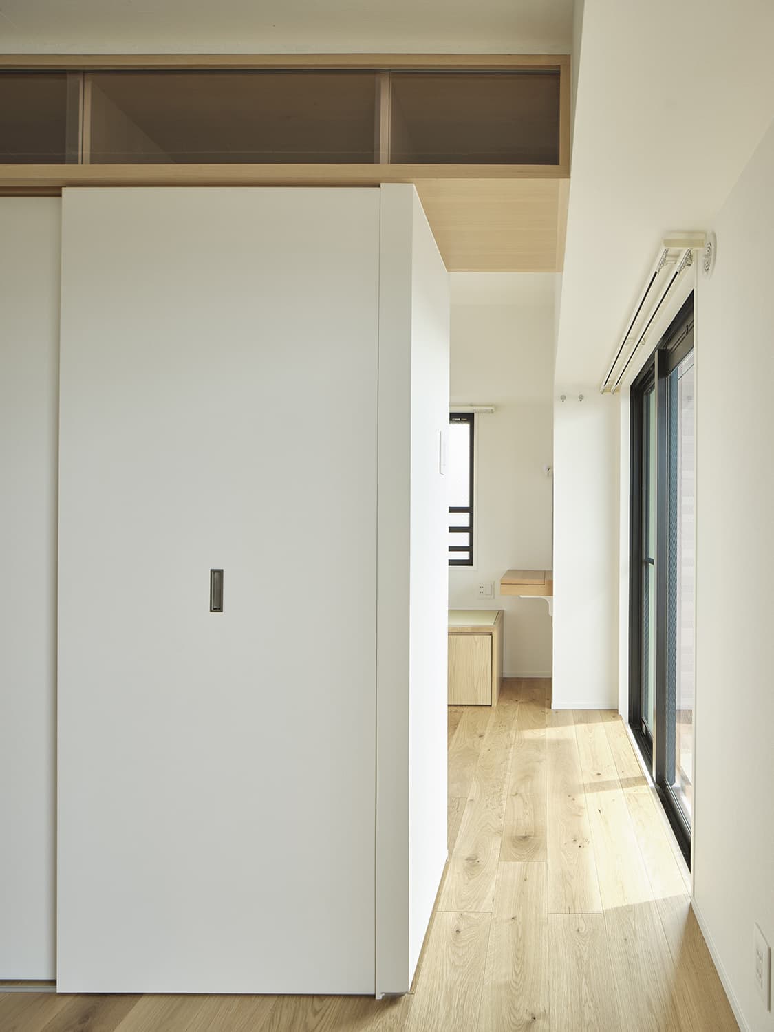 玄関から上がった先にも腰壁高さの靴収納を計画しています。その上の白いマグネットパネルにはお施主さんの好きな絵本作家の絵画を展示できるように計画しています。