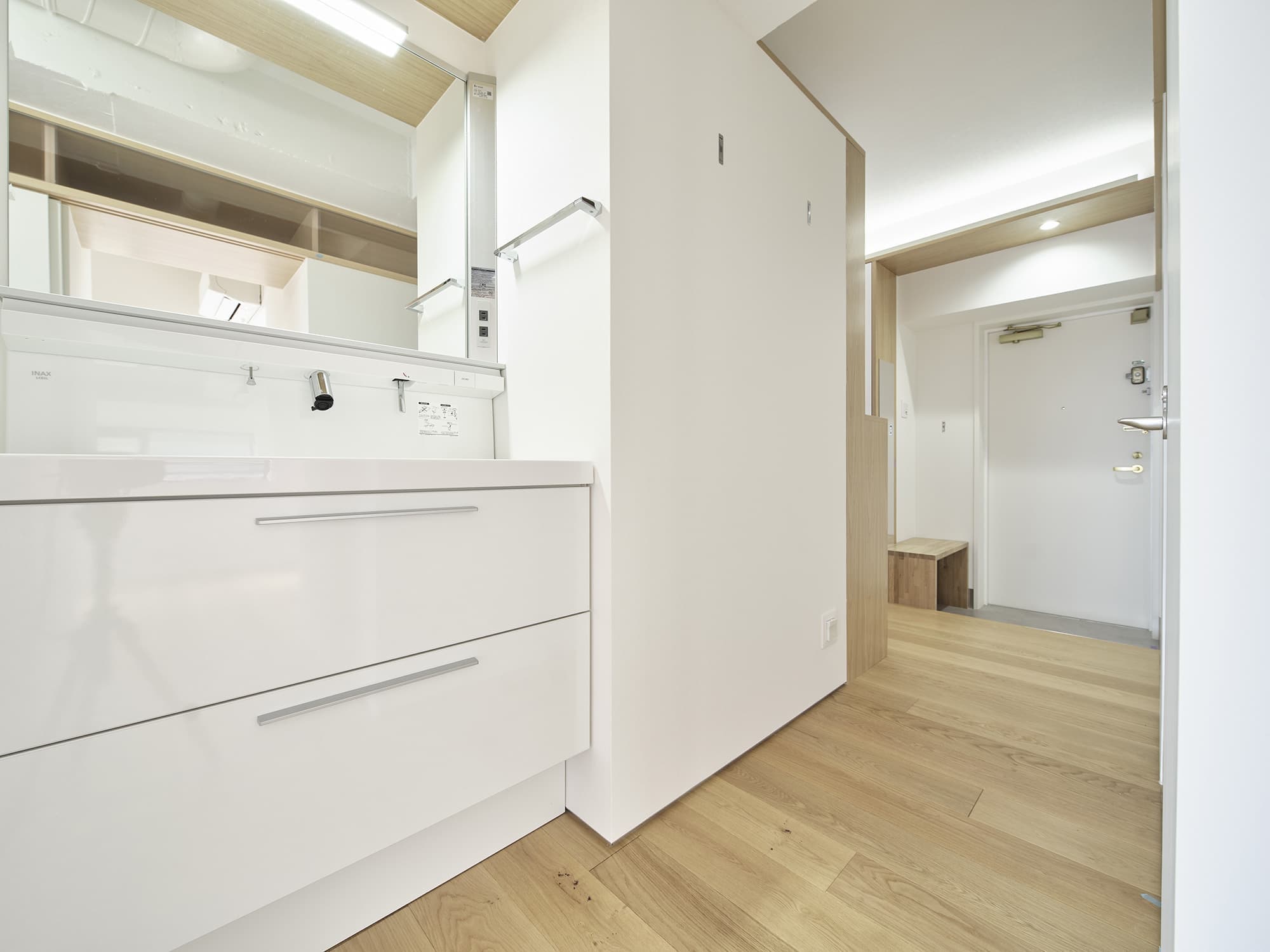 洗面スペースは玄関、脱衣スペース、寝室から近い位置に配置し、利用しやすい導線計画としています。洗面スペースの隣の壁面にはコートなどを掛けられるフックを2つ設置しています。
