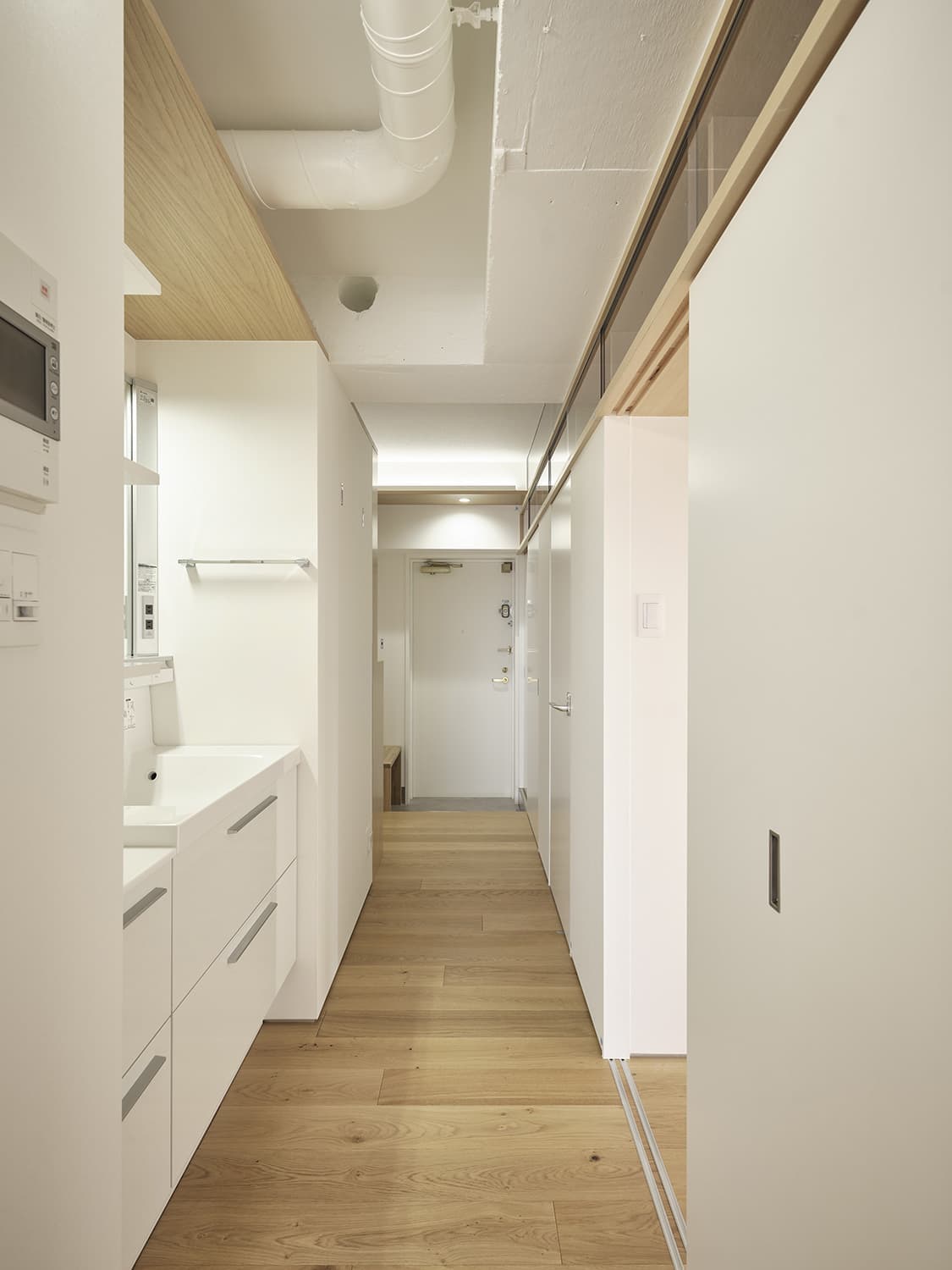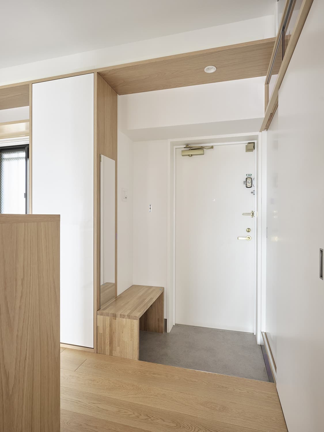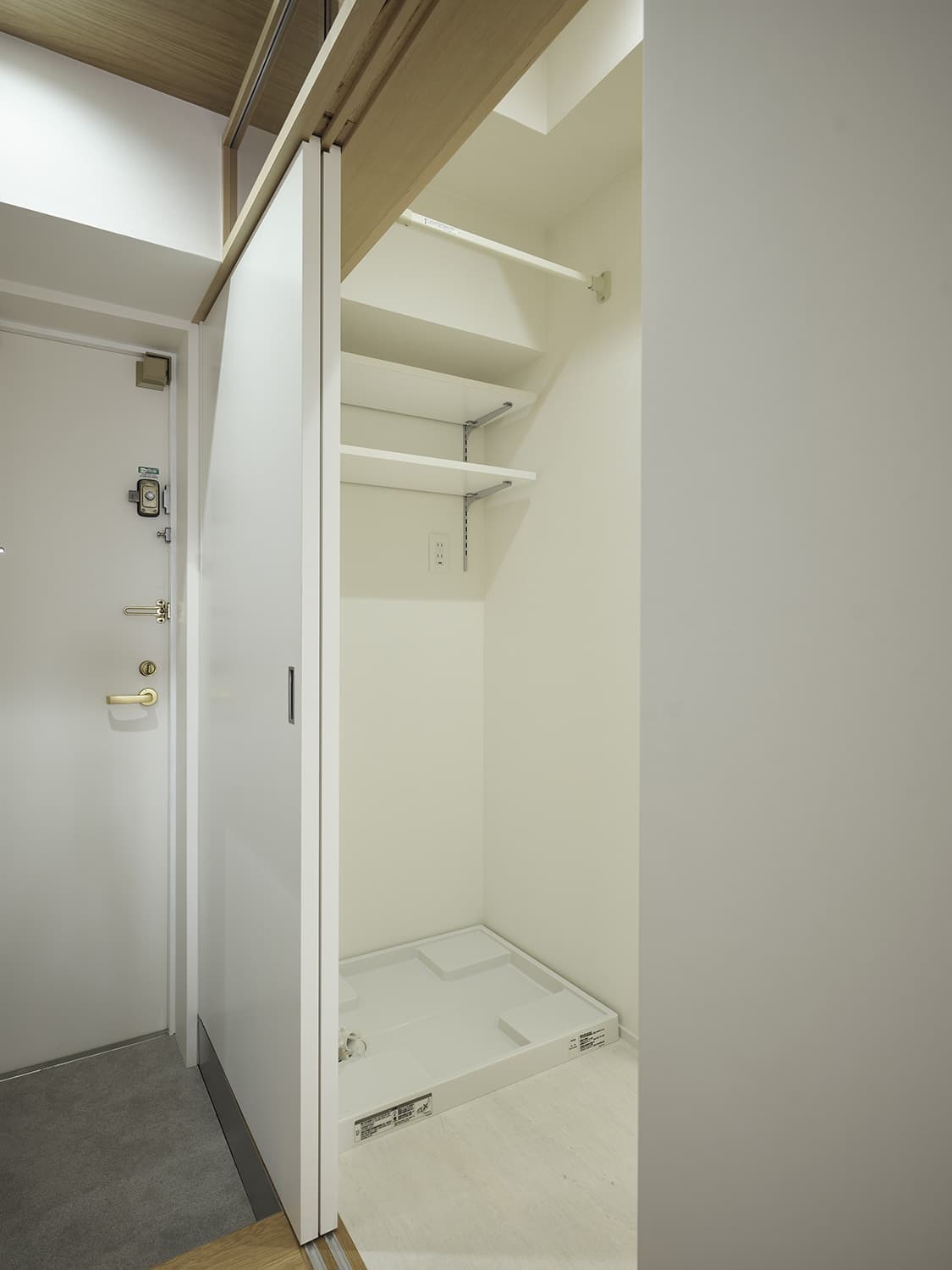玄関前で座って靴を履けるようオーク製の造作ベンチを設置しています。ベンチの後ろは靴や傘収納を計画しています。玄関から入って左側に見える引き戸は開けると洗濯機置き場が有り、横からも洗濯機の下や裏側を掃除できるようにしています。