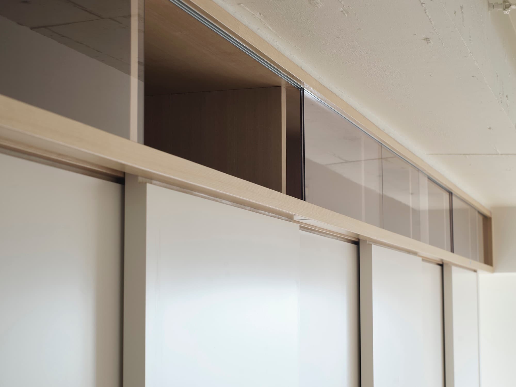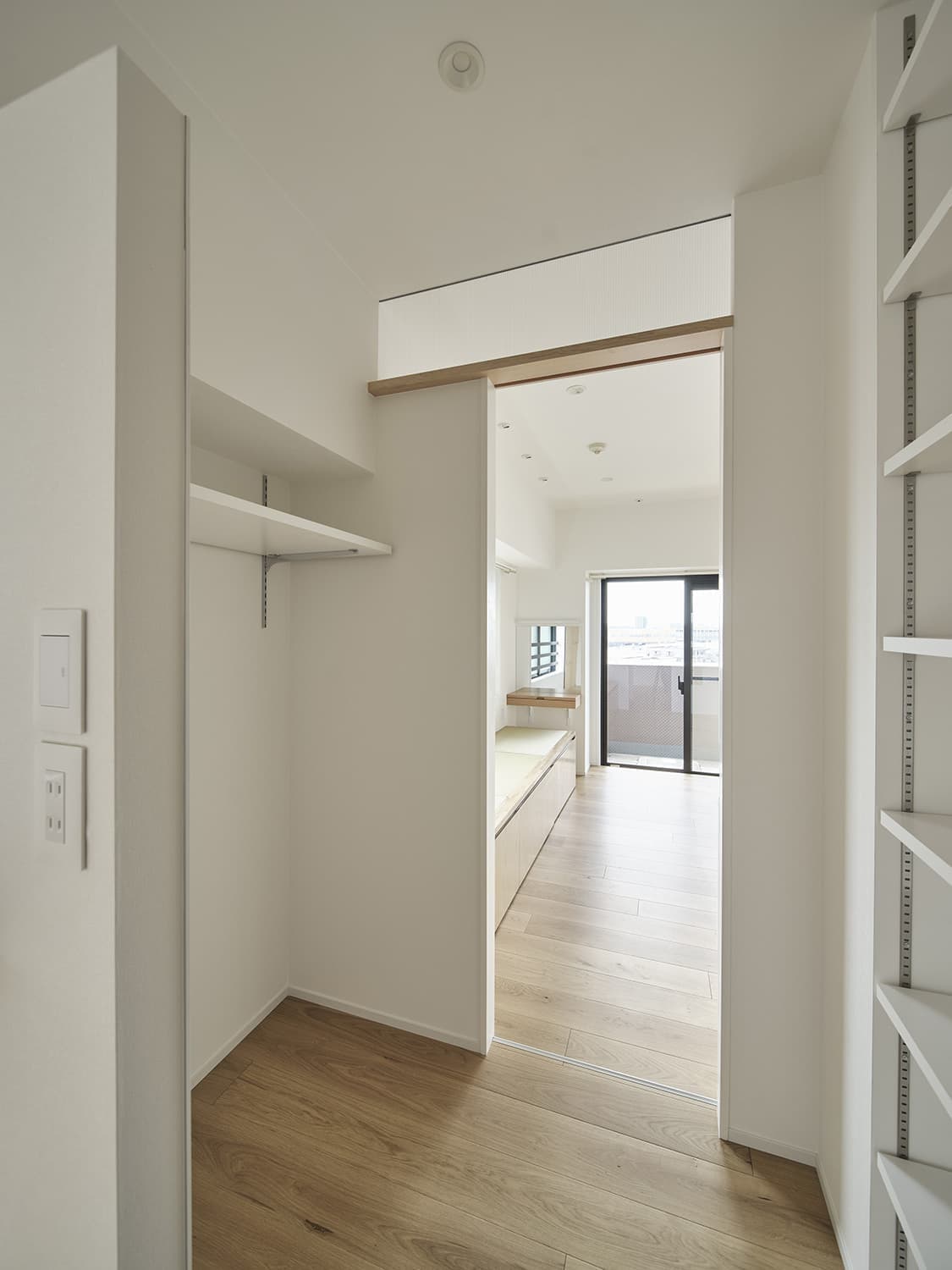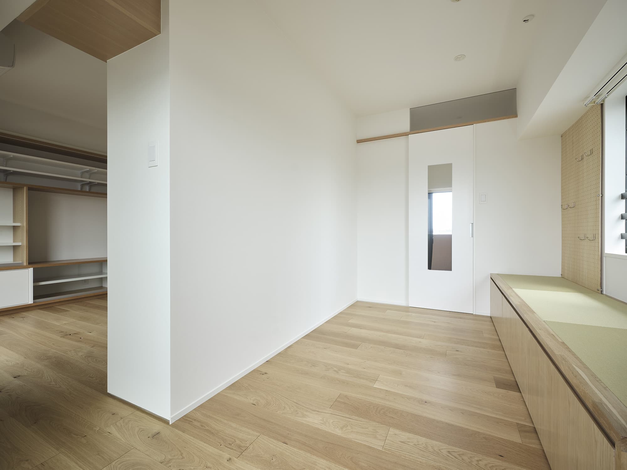 リビンの裏には洋服を収納し、身支度を整えることができるドレッシングスペースを計画しています。白い壁の部分にはお施主さんが所有されているオーダーメイドの洋服タンスが置けるようスペースを確保しています。向かいの畳スペースは休憩時に利用することの他、座りながら洋服を畳むことができるようなスペースとして計画しています。