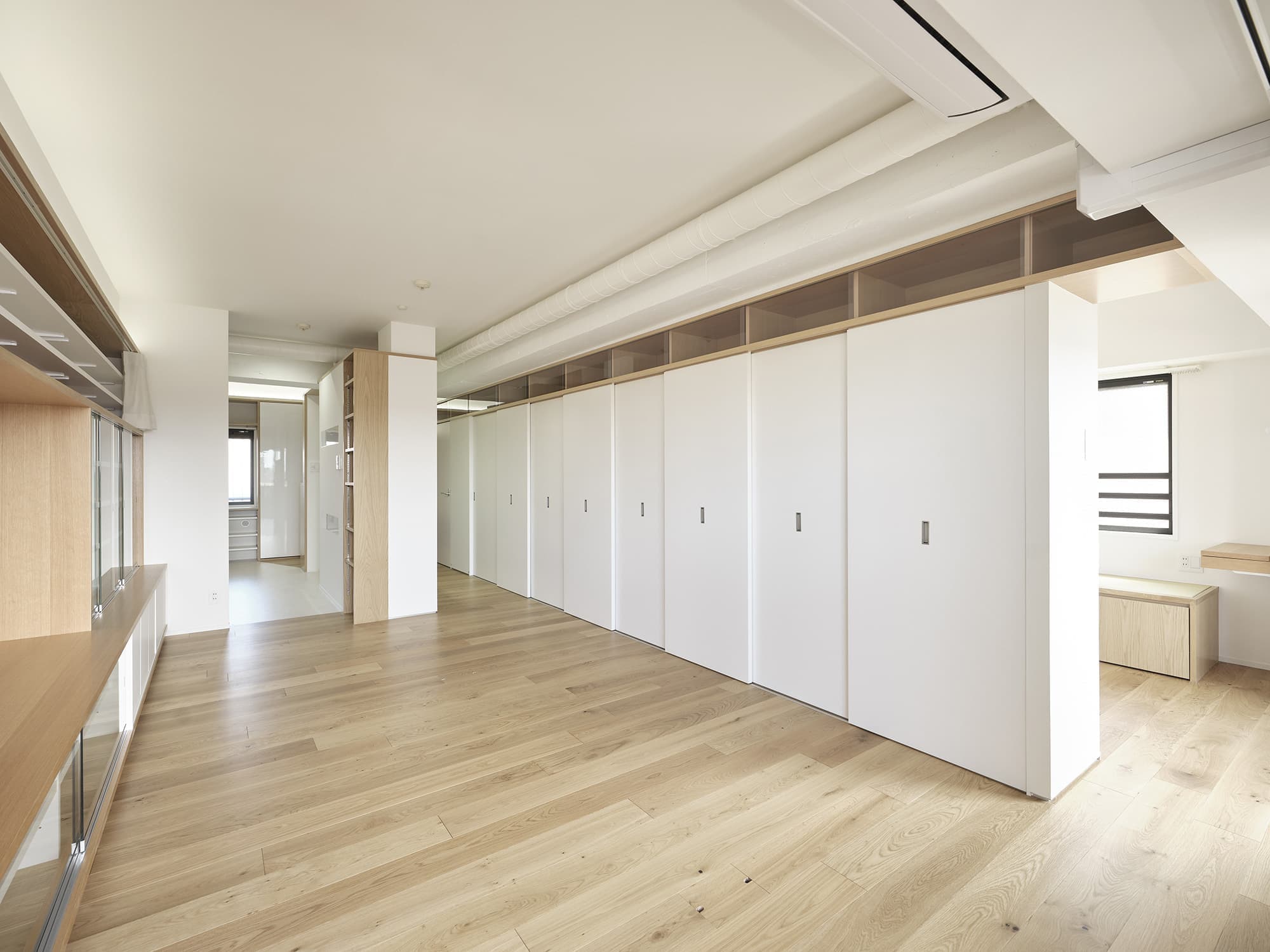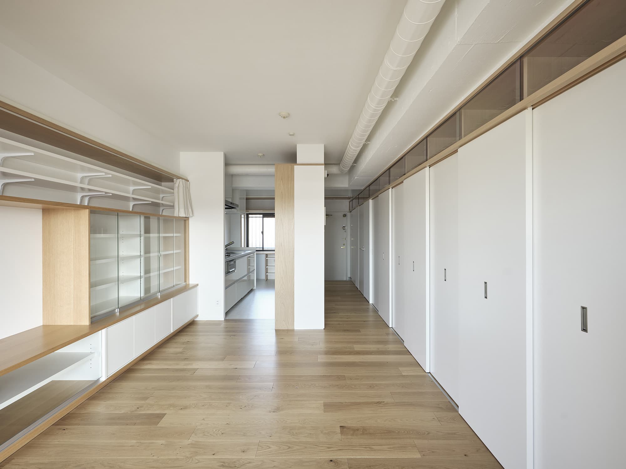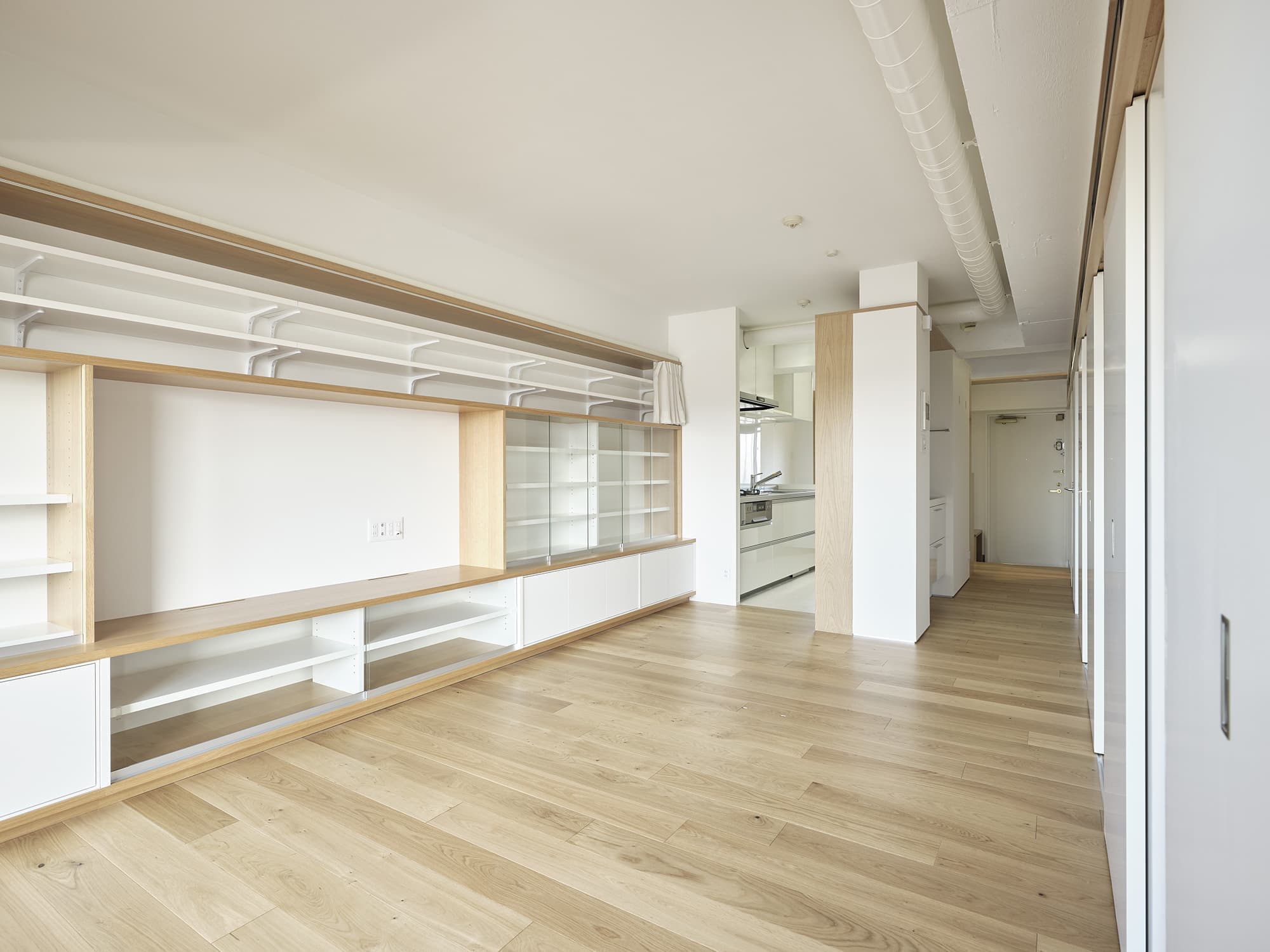 お施主さんは2000枚以上に及ぶCD(総厚25m以上)、500枚以上のDVD、LP、総厚11m以上の書籍、展示用カップや絵画などたくさんの物に囲まれながら60㎡ほどの住戸で生活をされていましたが、それらのコレクションを展示・収納しながら住まう方法に苦慮されていました。私たちに対する要望はそれらのコレクションと共に暮らす住まいのリノベーションでありました。そこで住戸内の中心と外壁沿いに展示・収納ボリュームを設け、それらを囲むように8の字型の「道」のような空間をつくることで、コレクション巡りをしながら所有感を満たす住まいの提案を行いました。