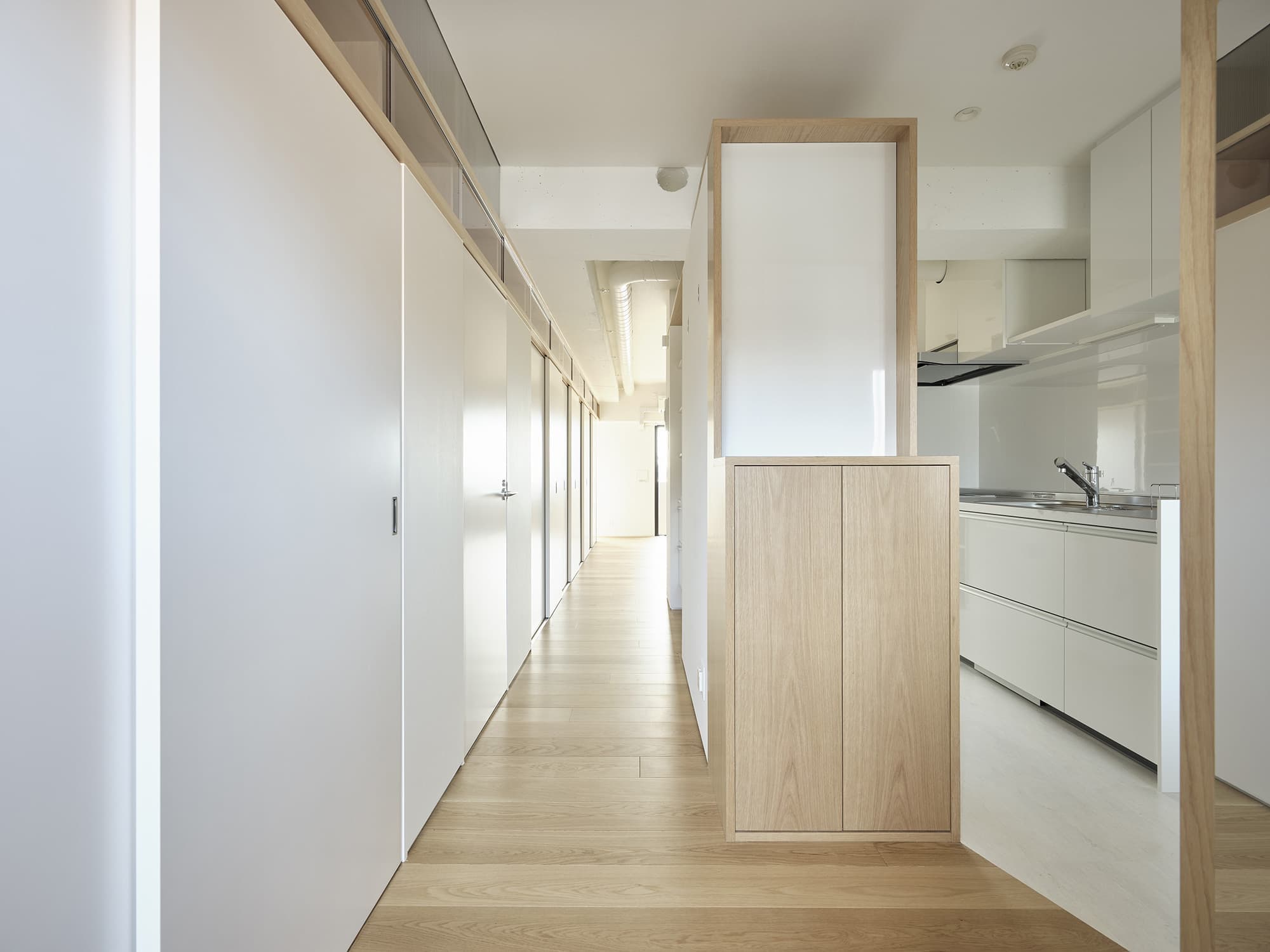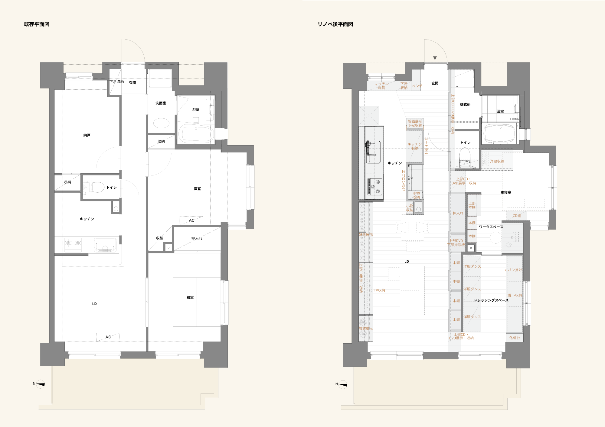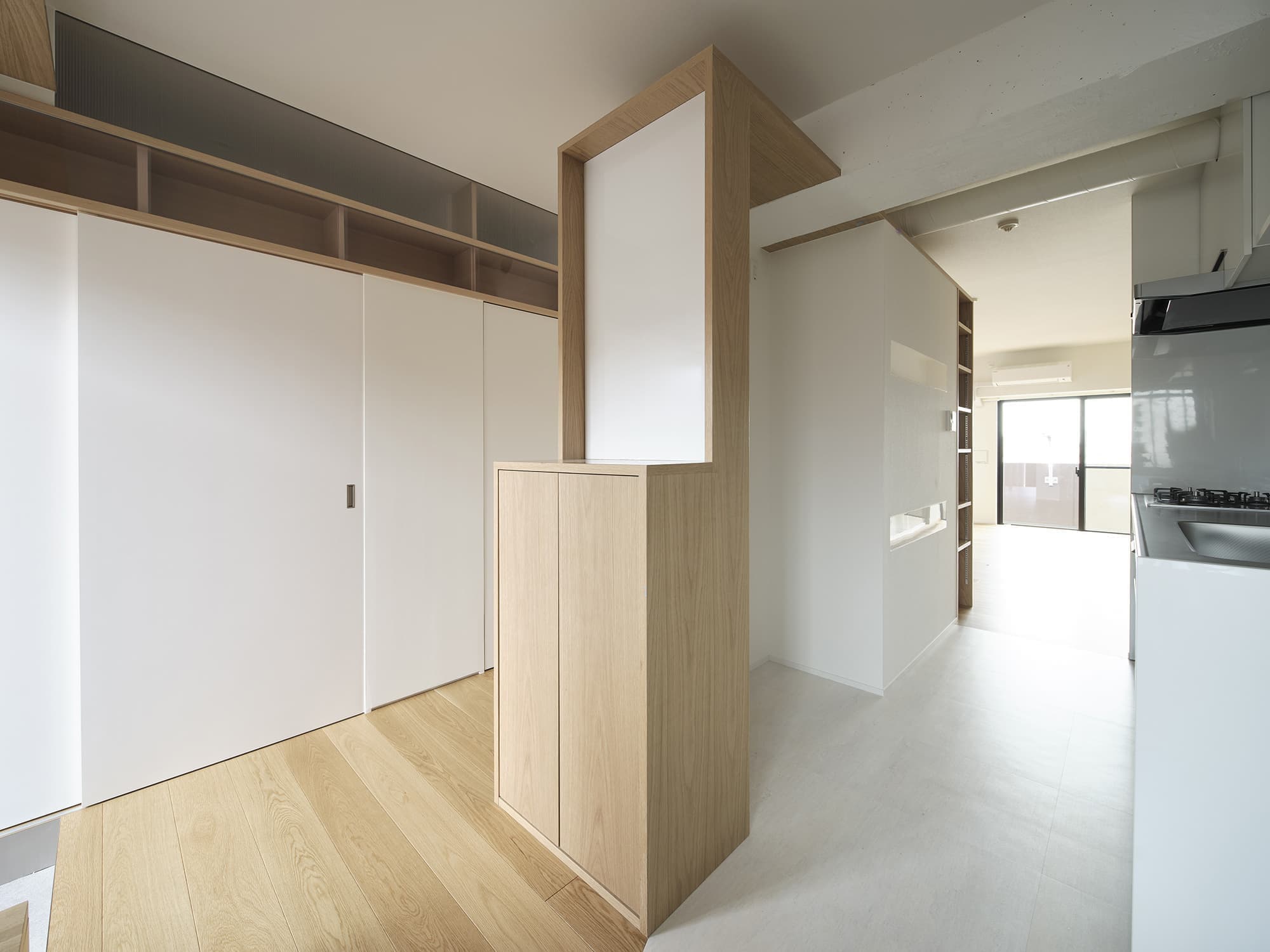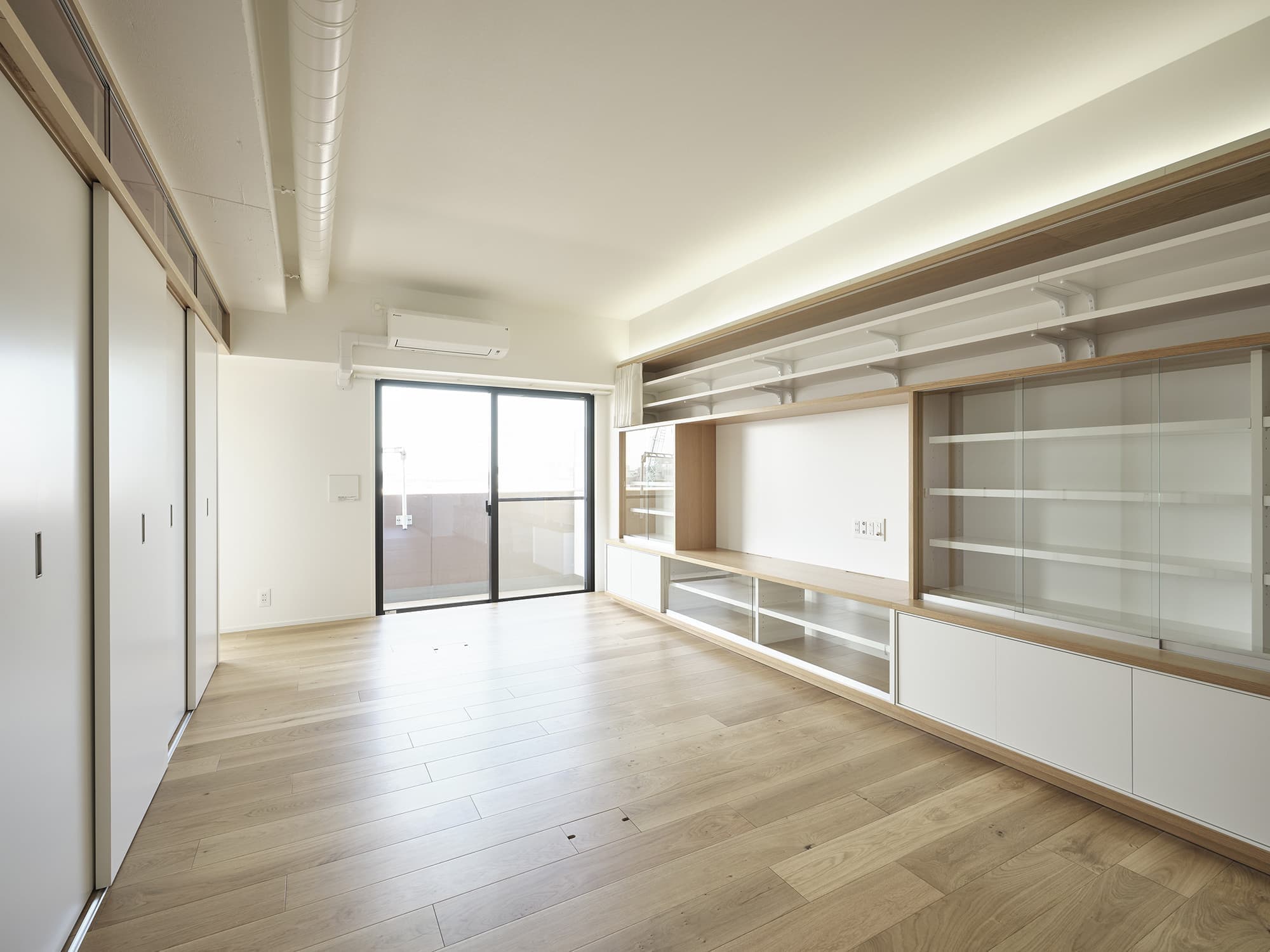 お施主さんは2000枚以上に及ぶCD(総厚25m以上)、500枚以上のDVD、LP、総厚11m以上の書籍、展示用カップや絵画などたくさんの物に囲まれながら60㎡ほどの住戸で生活をされていましたが、それらのコレクションを展示・収納しながら住まう方法に苦慮されていました。私たちに対する要望はそれらのコレクションと共に暮らす住まいのリノベーションでありました。そこで住戸内の中心と外壁沿いに展示・収納ボリュームを設け、それらを囲むように8の字型の「道」のような空間をつくることで、コレクション巡りをしながら所有感を満たす住まいの提案を行いました。