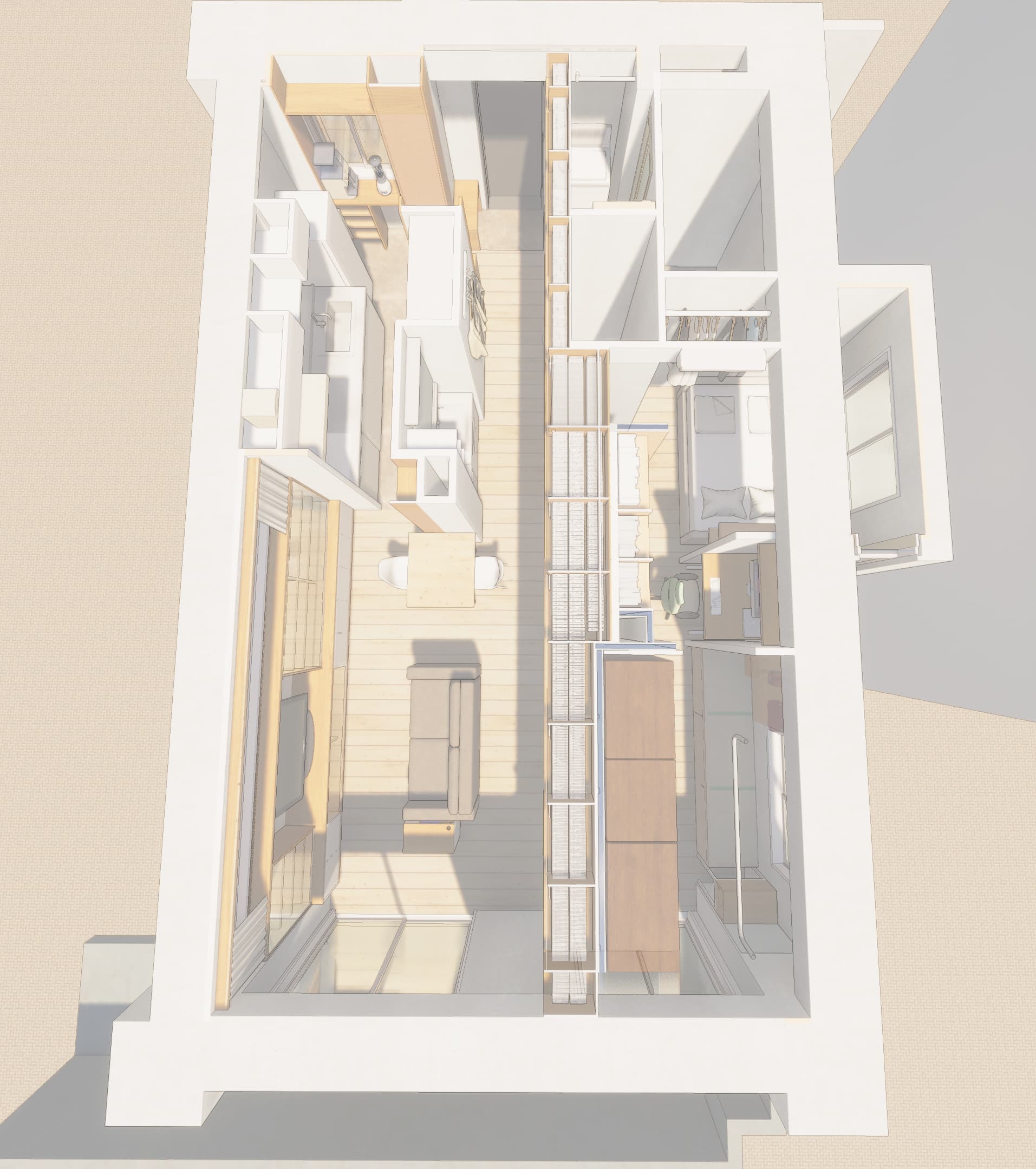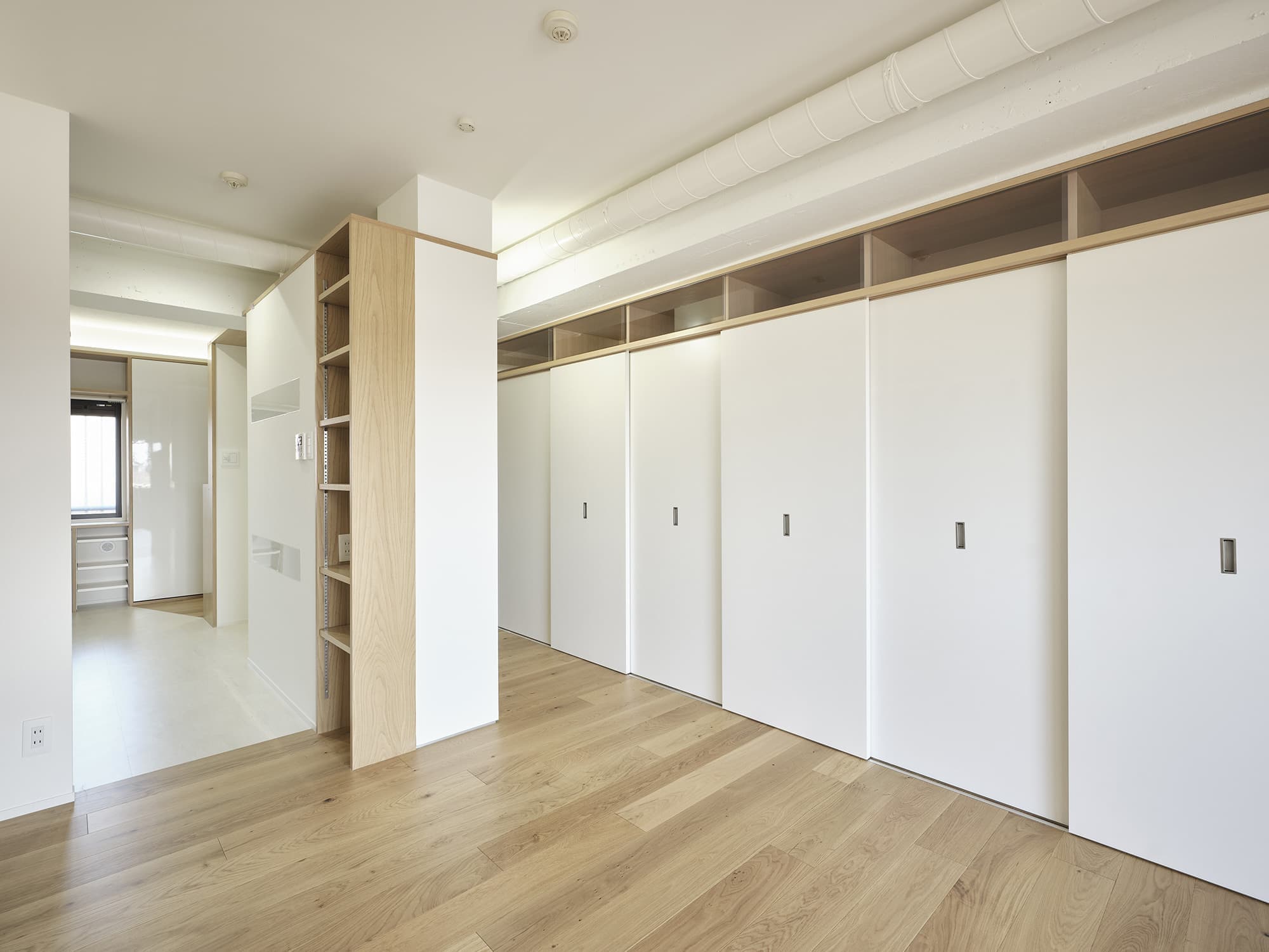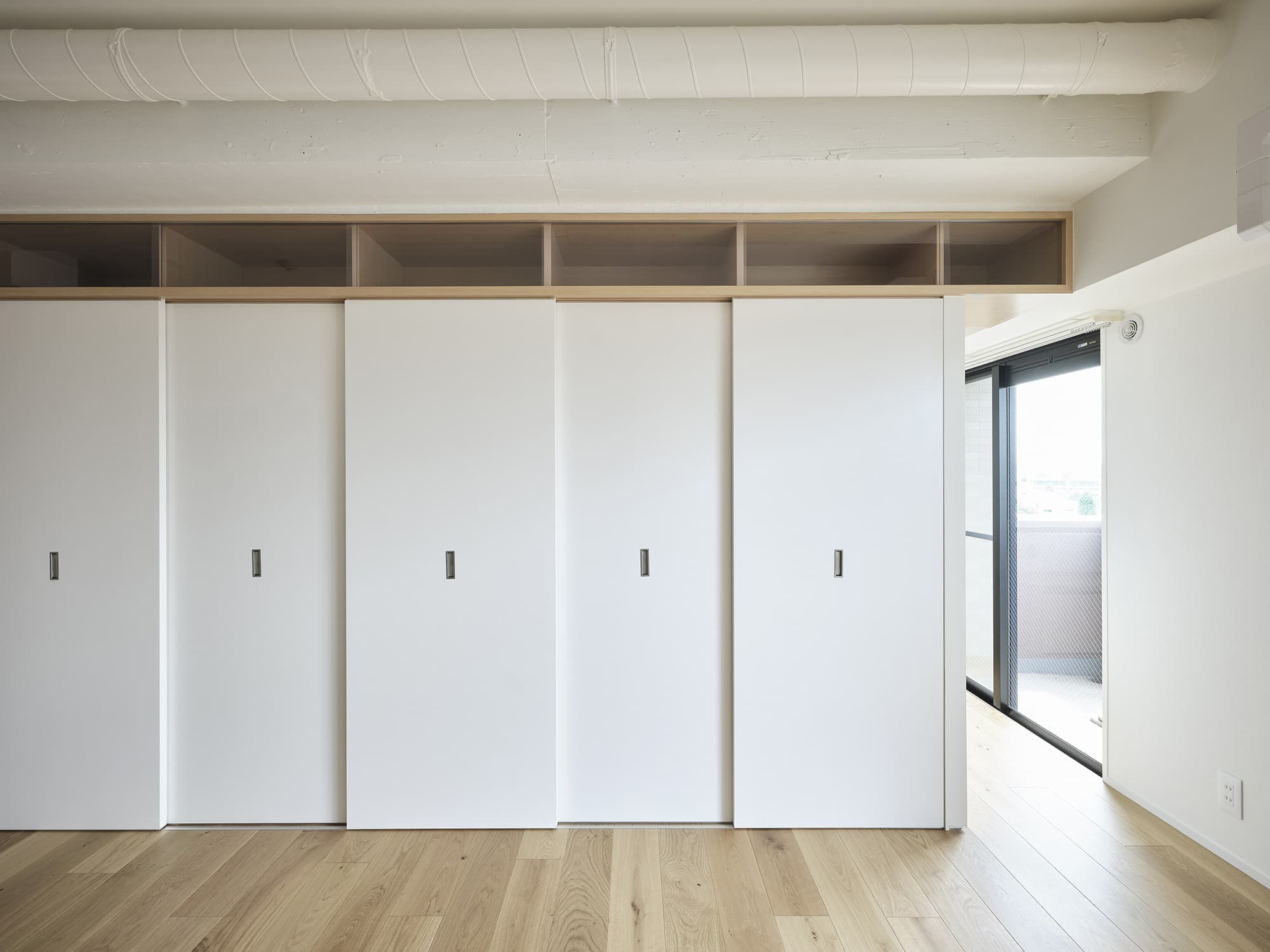 また夫婦2人暮らしのお施主さんの要望はなるべく仕切りをなくしたワンルーム空間であることと同時に、リモートワーク時に生活音が聞こえないようにしたいことでした。そのような理由からコレクションを展示・収納できるボリュームはワークスペースとリビングの間に設け、収納する物が多いほど遮音性能が向上するようなプランを考えました。上部は東西一面にCD用の展示・収納棚をつくり、長年集積されたコレクションを眺めなら暮らすことができます。