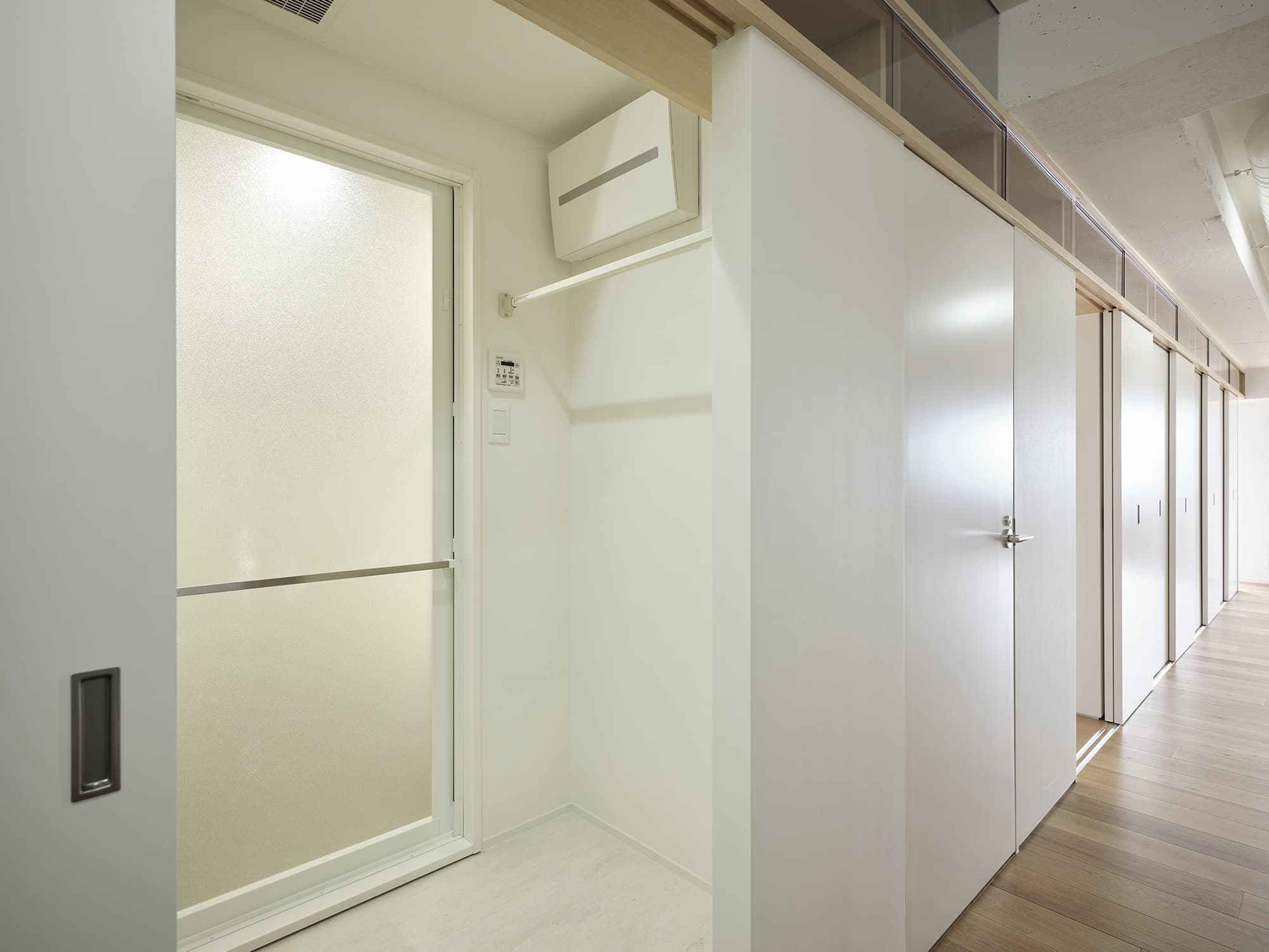 玄関ホール左側に脱衣スペース、トイレを配置し、上部はCD収納棚を設けています。CD収納の上はポリカーボネートを設け、閉塞感を感じないように配慮しています。