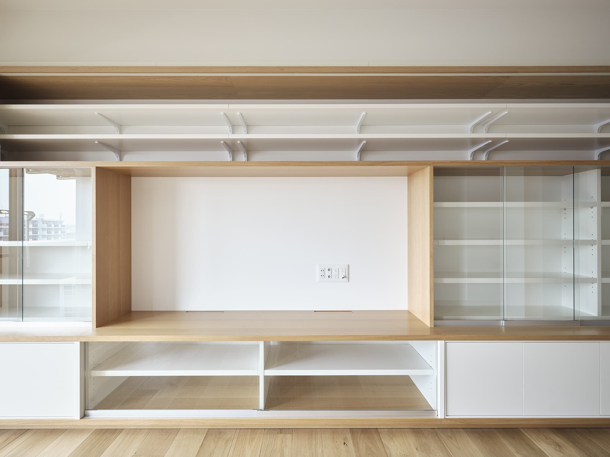 リビングの壁両面に展示・収納スペースを計画しています。白い引き戸の中は書籍やDVDを収納できるよう計画し、テレビ台の横にはコレクション用のカップや雑貨を展示するスペースを設けています。それぞれ上部はCDを収納できるスペースを計画しています。