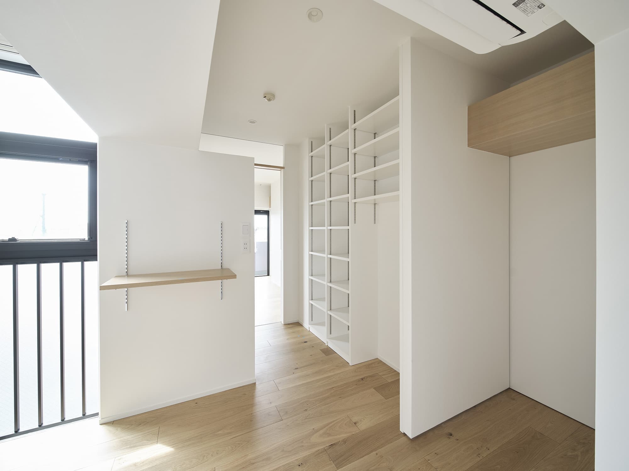 ベッドスペースの奥にワークスペースを計画しています。仕事用の本を収納できる造作の可動棚を設け、その向かいにワークデスク設置場所を設けています。作業に集中できるようデスク横に壁を設け、ビデオ会議をした時にベッドなどが見えないように机や棚の配置を考えています。