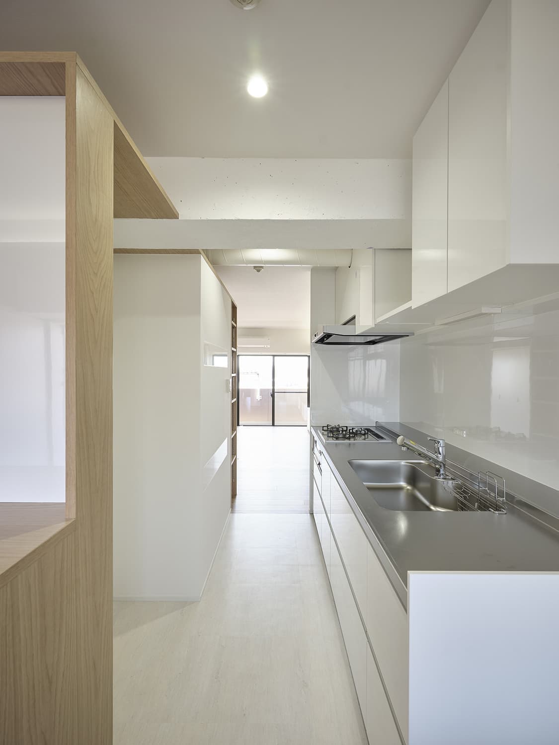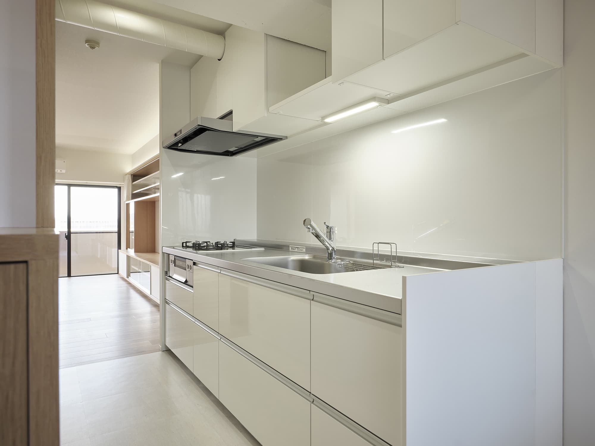 キッチンはステンレス天板でシンプルな形状のものを選定しています。キッチンの背面壁の一部にマグネットパネルを設置し、エプロンなどを掛けることができるよう計画しています。