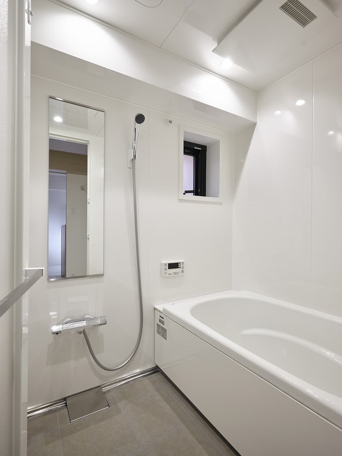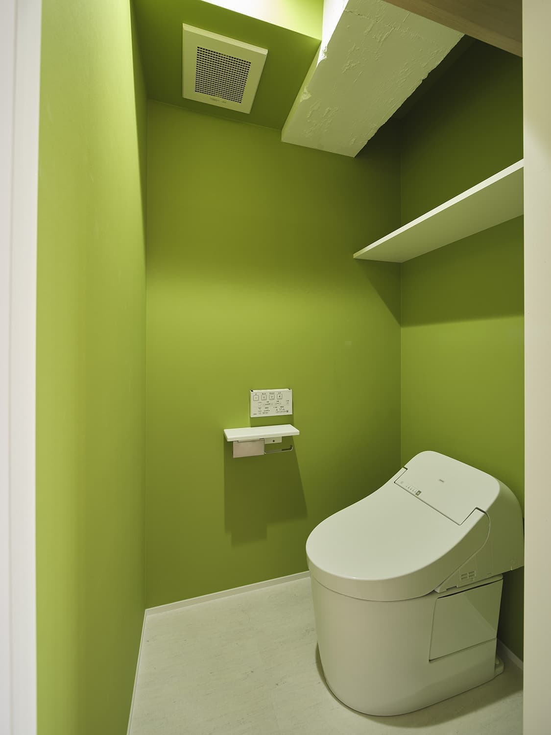 お風呂の浴槽はホーロー浴槽を選定しています。トイレの壁はお施主さんが気に入った緑色を選定しています。