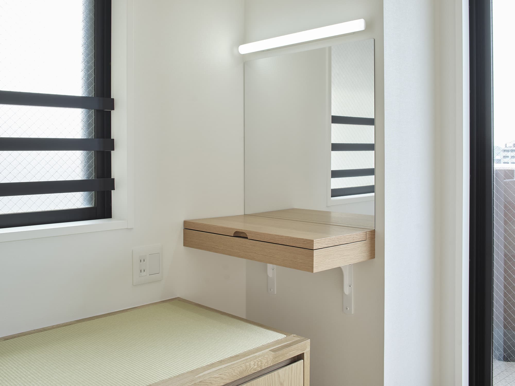 ドレッシングスペースにはオーク製の造作化粧台を計画しています。化粧台の高さや奥行き、収納量は事前にお施主さんと何度もやりとりを行い、要望に沿ったサイズで計画しています。