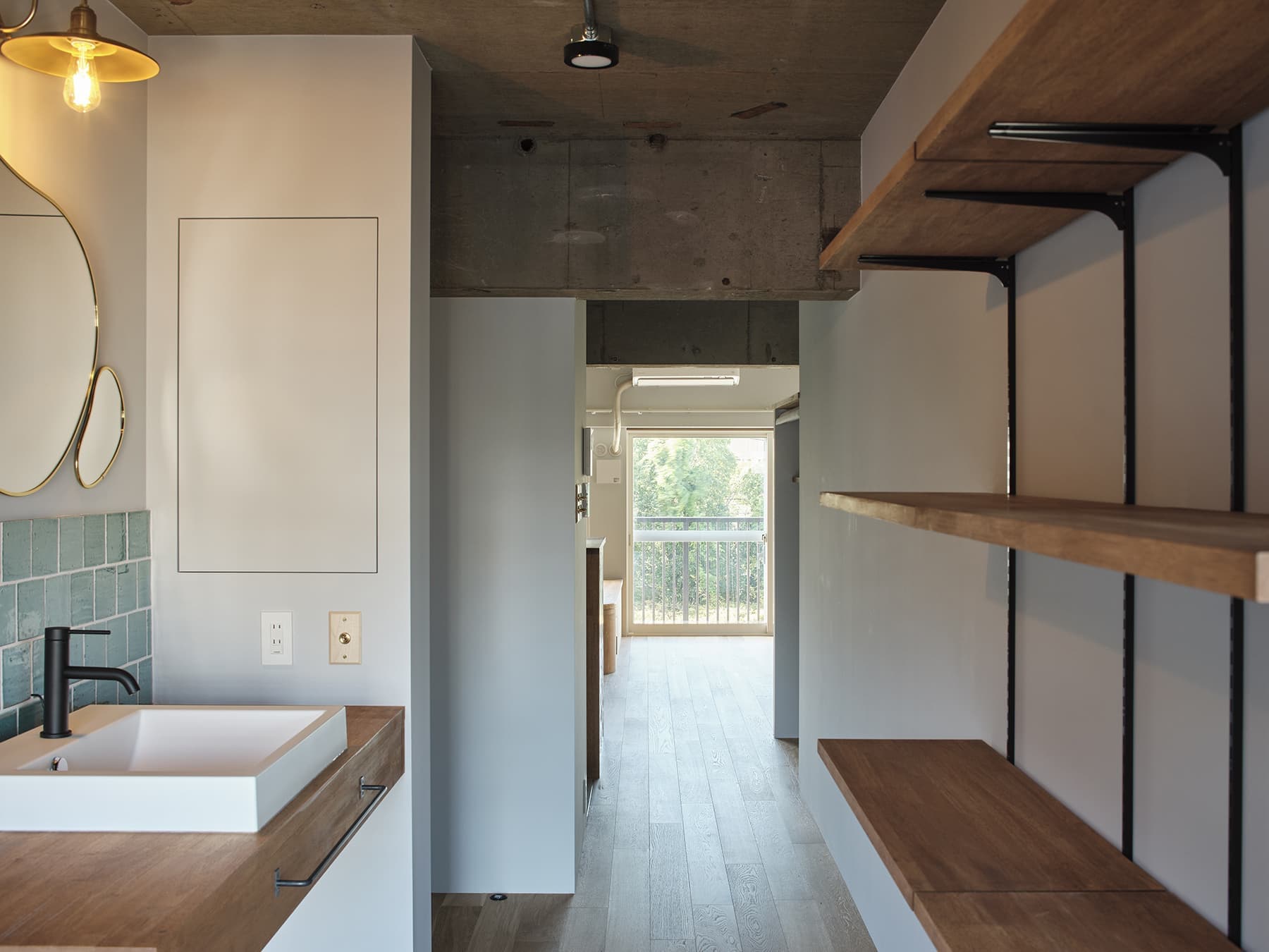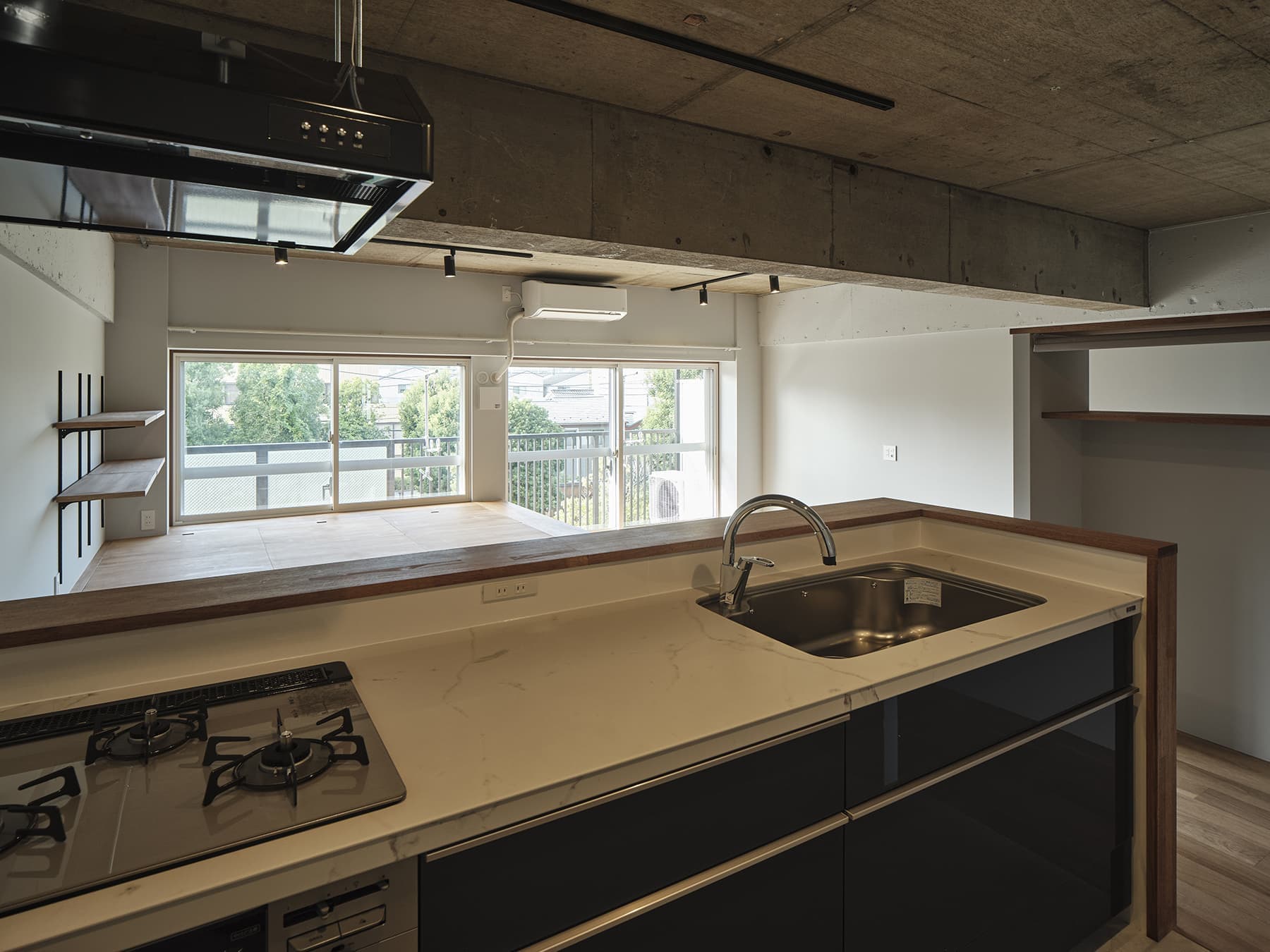 築約40年ほどのマンション住戸リノベーション計画。忙しい日常を過ごされているお施主様にとって、常に何かに追われるのではなく、ぼーっとする時間、余白をとり、気持ちのゆとりがもてる居場所を希望されていました。そこでワンルームの間取りを計画し、リビングやキッチンだけでなく、玄関や廊下スペースもゆとりをもたせて設けると共に、住戸全体に風の抜け道をつくり、住戸全体がおおらかな設えとなるように考えました。緑豊かな周辺環境において、窓側にはリビングの他に小上がりスペースを設け、豊かな緑を眺めながらゆったりと過ごせる空間を計画しました。玄関を抜けてすぐの広々としたスペースには、オンオフの切り替えの場所として大切な洗面スペースをお施主様のこだわりがつまったデザインに仕上げました。
